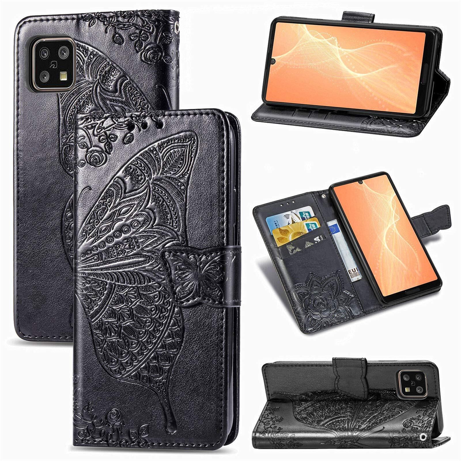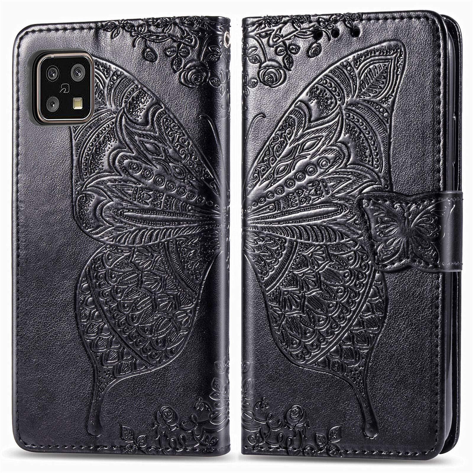 対応AQUOS sense4 docomo SH-41A sense5G SH-53A au SHG03 sense4 lite sense4 basic ケース 手帳型 ノートブック型携帯電話保護カバー多機能携帯電話ホルスター財布携帯電話ホルダーバンプパターンテクスチャ耐久性摩擦耐性携帯電話ケース男性と女性に適した多色オプション (バタフライ黒)