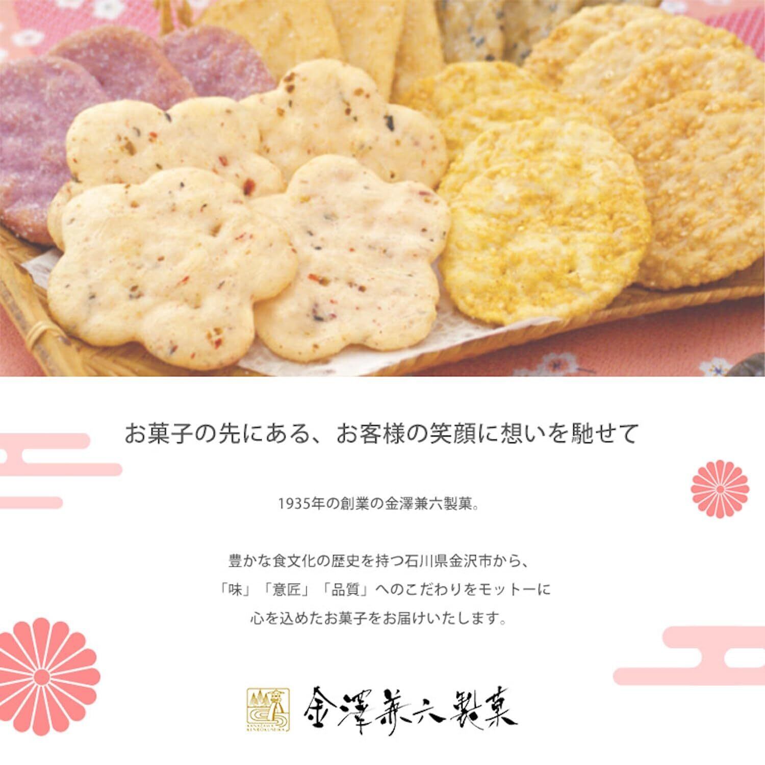 内容量:黒ゴマ入り玄米煎餅x6枚、エビカレーせんべいx6枚、えびまめ花煎餅x3枚、海老胡椒せんべいx6枚、金澤カレー煎餅x3枚、つぶやきサラダx3枚