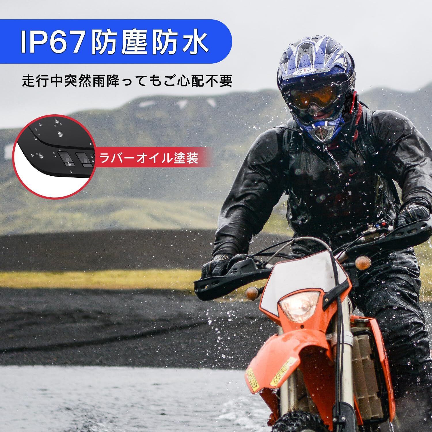 【超連続使用時間&IP67基準防水】1000mAh大容量電池を内蔵し、連続インターコム通話時間最大28時間、音楽連続再生時間最大33時間、待機時間が最大360時間に達します。タイプC充電口、最短2時間でフル充電できます。本体はIP67基準防水仕組み、走行中突然雨降っても心配しません。