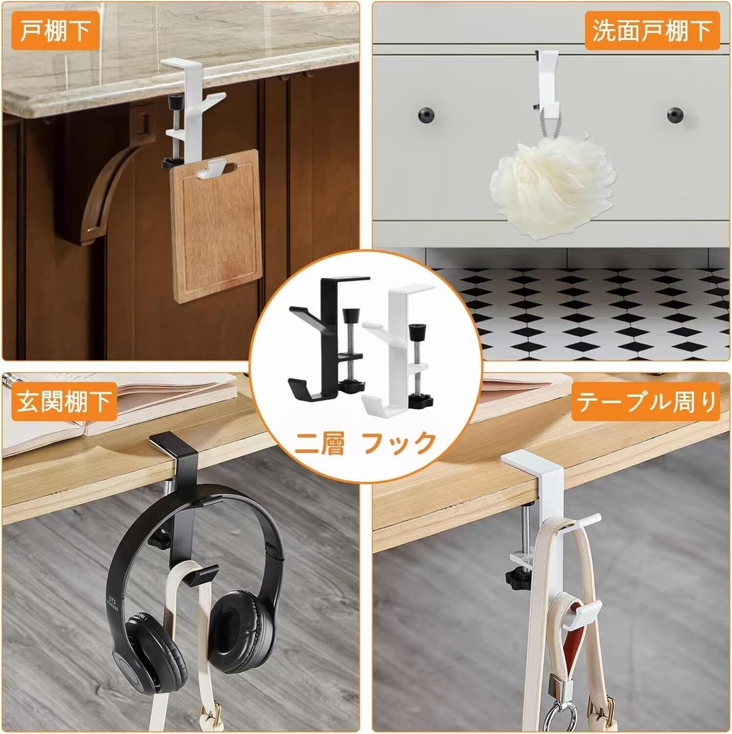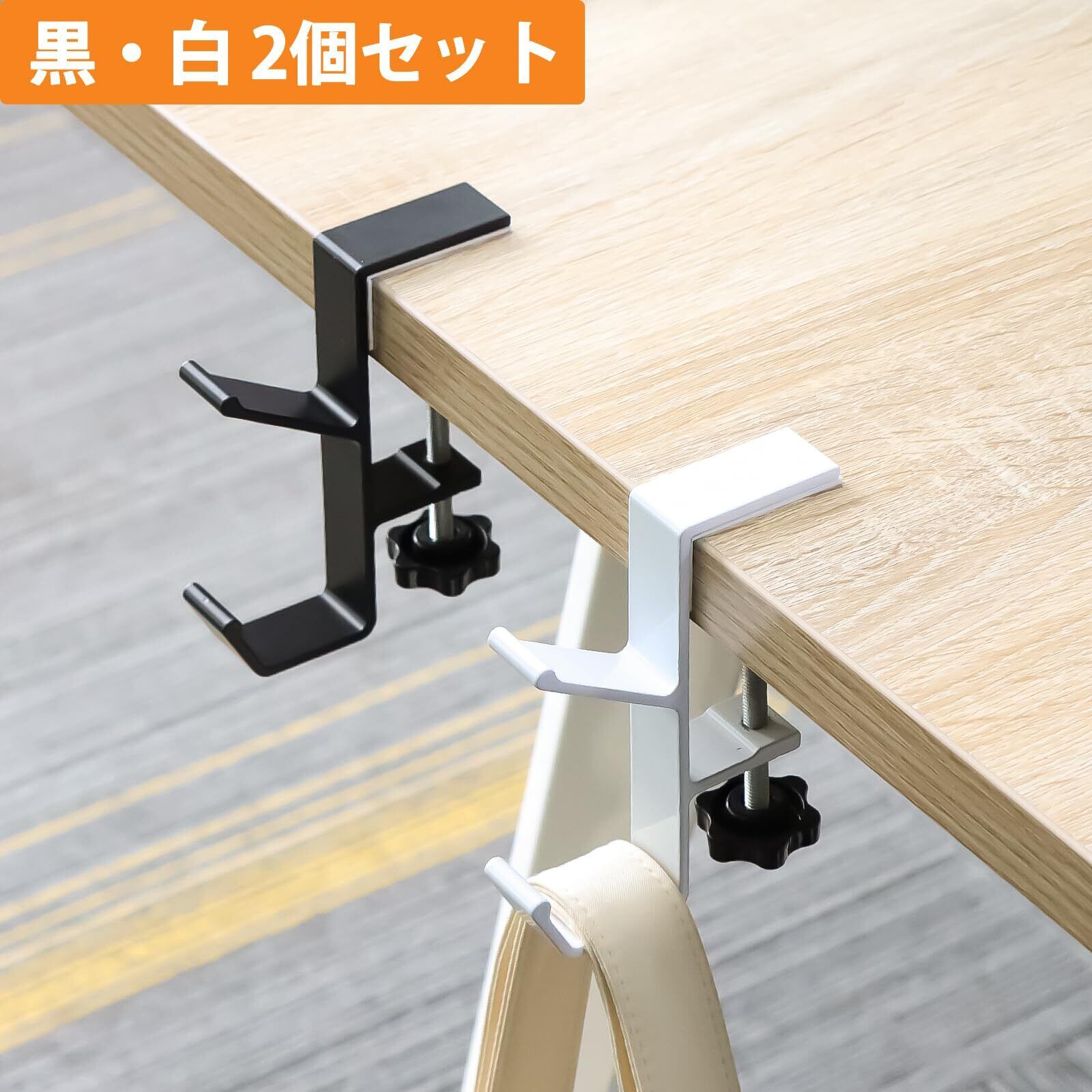 テーブルフック 2個セット デスク 机 フック 固定式/調節可能 机にかけるフック ヘッドホンフック 洗面所 戸棚下 自由に配置可能タイプ(黑/白)