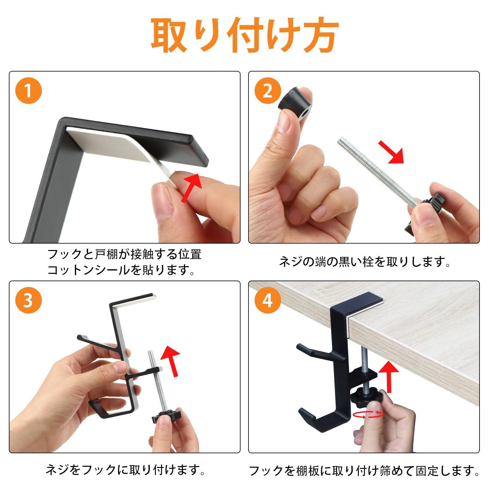 【調節可能、二層構造】テーブル適用の厚さ:約1 ~5cm。フックのネジは調節可能で、様々な厚さの棚板やテーブル周りに取り付けることができます。