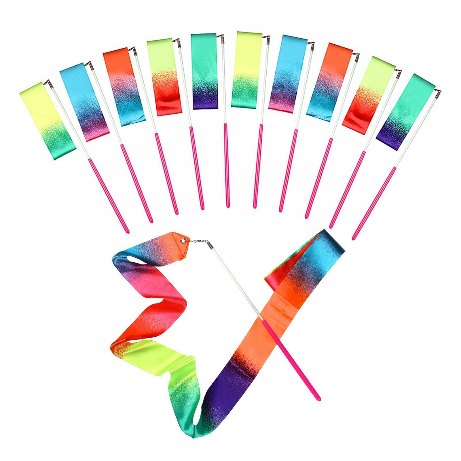 MUDOR 10個の2メートル長の新体操 リボン、子供のためのくるくる杖および虹のダンスのリボン