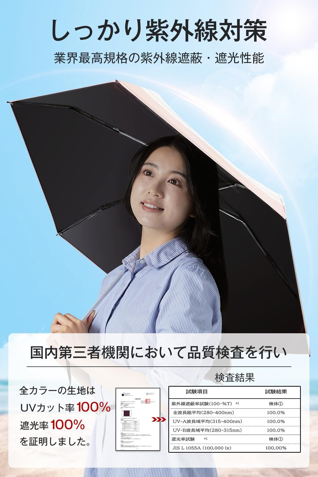 【100%紫外線遮蔽 &-16℃の遮熱効果】JIS規格試験で遮光率100%・UVカット率は全色100%、UPF50+(国内第三者検査機関による確認済み)!日焼けを防ぐために必要なUVカットの性能を兼ね揃えた、紫外線対策にはピッタリの折りたたみ日傘です。さらに涼しく過ごすための遮熱性も重視、断熱素材「酸化チタン」を練り込んだ素材を使用しています。開いたら、傘下温度の上昇を抑え、最大-16℃の遮熱効果を実現しました 暑い夏の熱中症対策にもぜひおすすめ!
