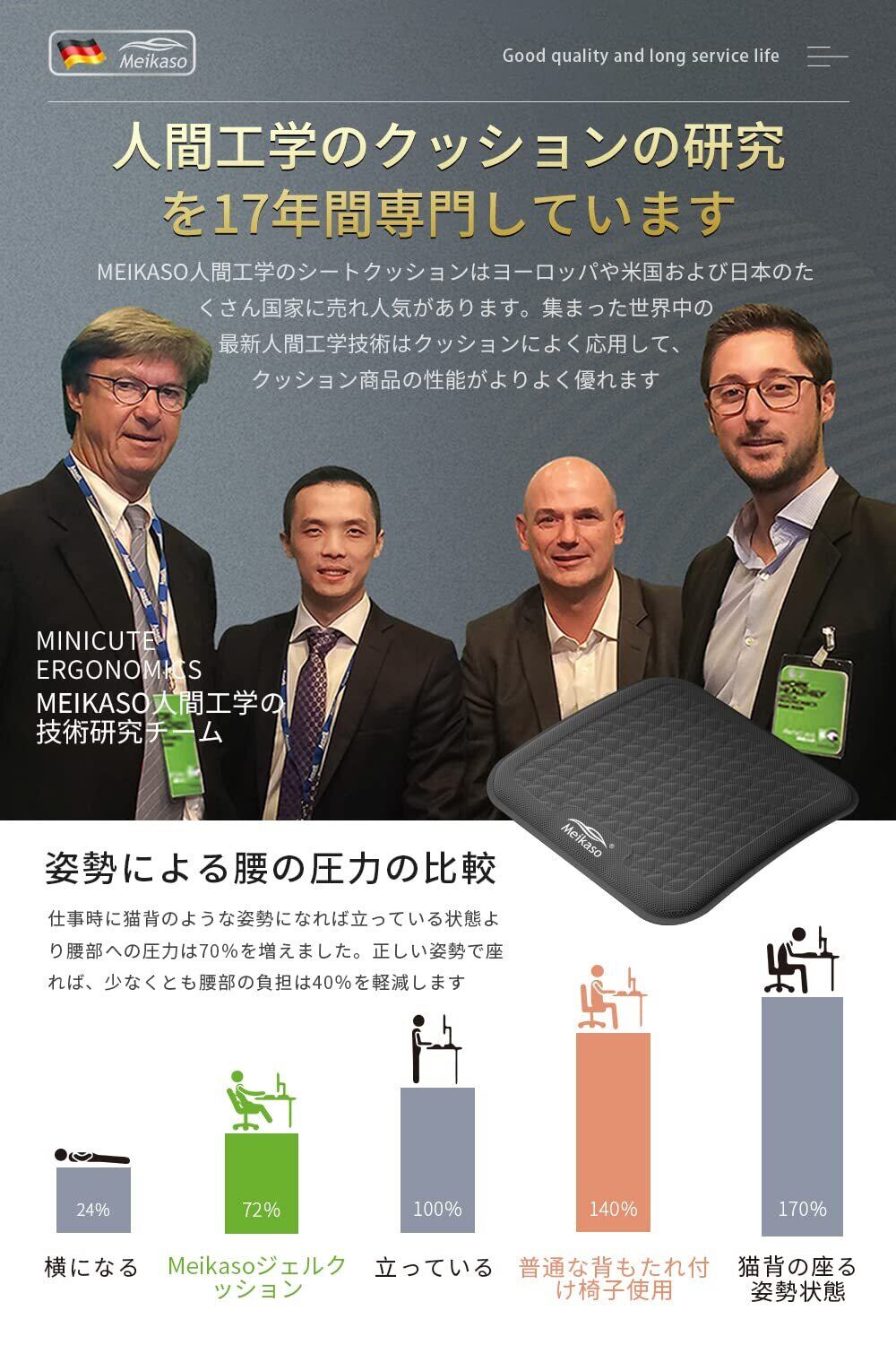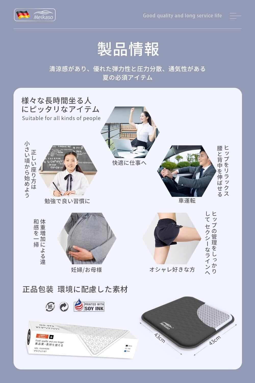 【創り上げる理想的な美姿勢】Meikasoは累計販売データと数年間の繰り返しのテストによりモダンファッションと購買ニーズが合う車ゲルクッションをデザインしました。ジェルクッションの弾力が局部に集中する体圧を分散させてくれるため、お尻の痛みの衝撃吸収を体感ください。サイズも比較的大きめなので、しっかりとお尻を包み込みサポートしてくれます。
