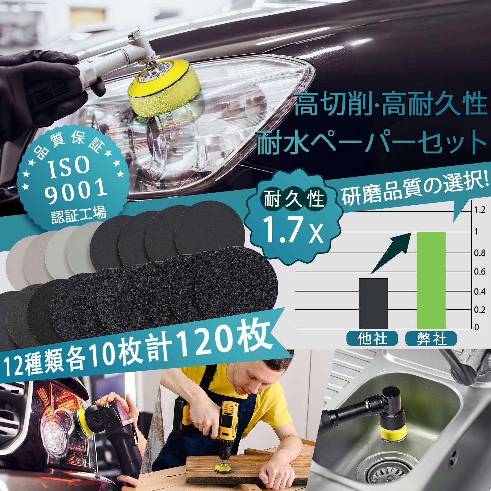 セット内容:120枚セット 75mm 耐水ペーパーです: #60 #80 #100 #150 #240 #400 #800 #1200 #2000 #3000 #5000 #10000 12種類各10枚で合わせて100枚セット耐水ペーパーです。 吸着盤2点、 3インチ ポリッシャーバフ2 枚、3インチ ウールパッド 1個、ボルト 轴 4個。