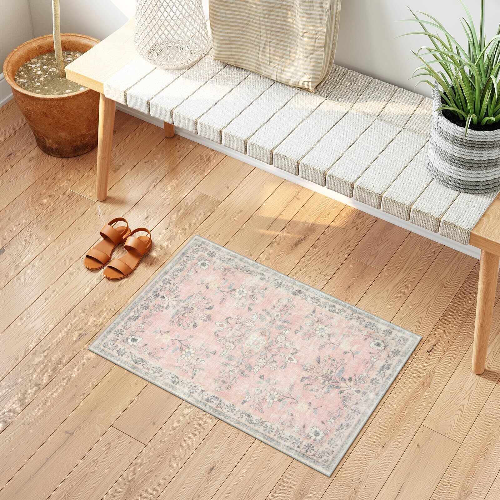 HAOCOO 玄関マット 室内 ペルシャ風 ラグマット 洗える 50х80cm 小さい おしゃれ 長方形 滑り止め 低反発 防音 屋外 泥落とし オールシーズン適用 耐磨耗性 軽量 花柄 コーラルピンク