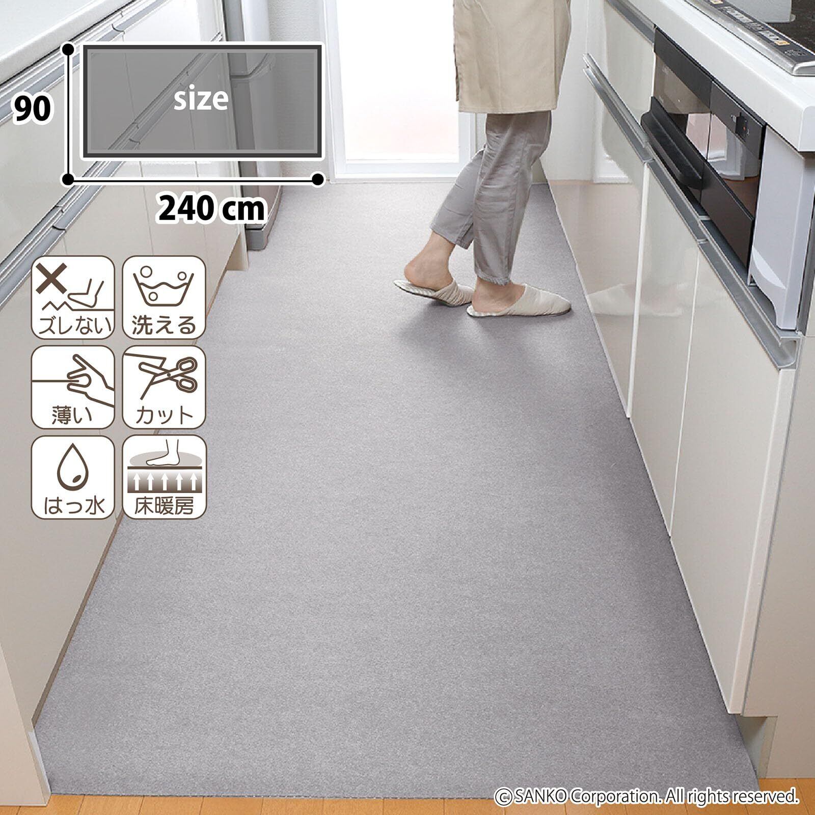 サンコー キッチンマット はっ水 洗える ロングマット 台所 廊下 日本製 おくだけ吸着 フラットタイプ 90×240cm グレー KY-29