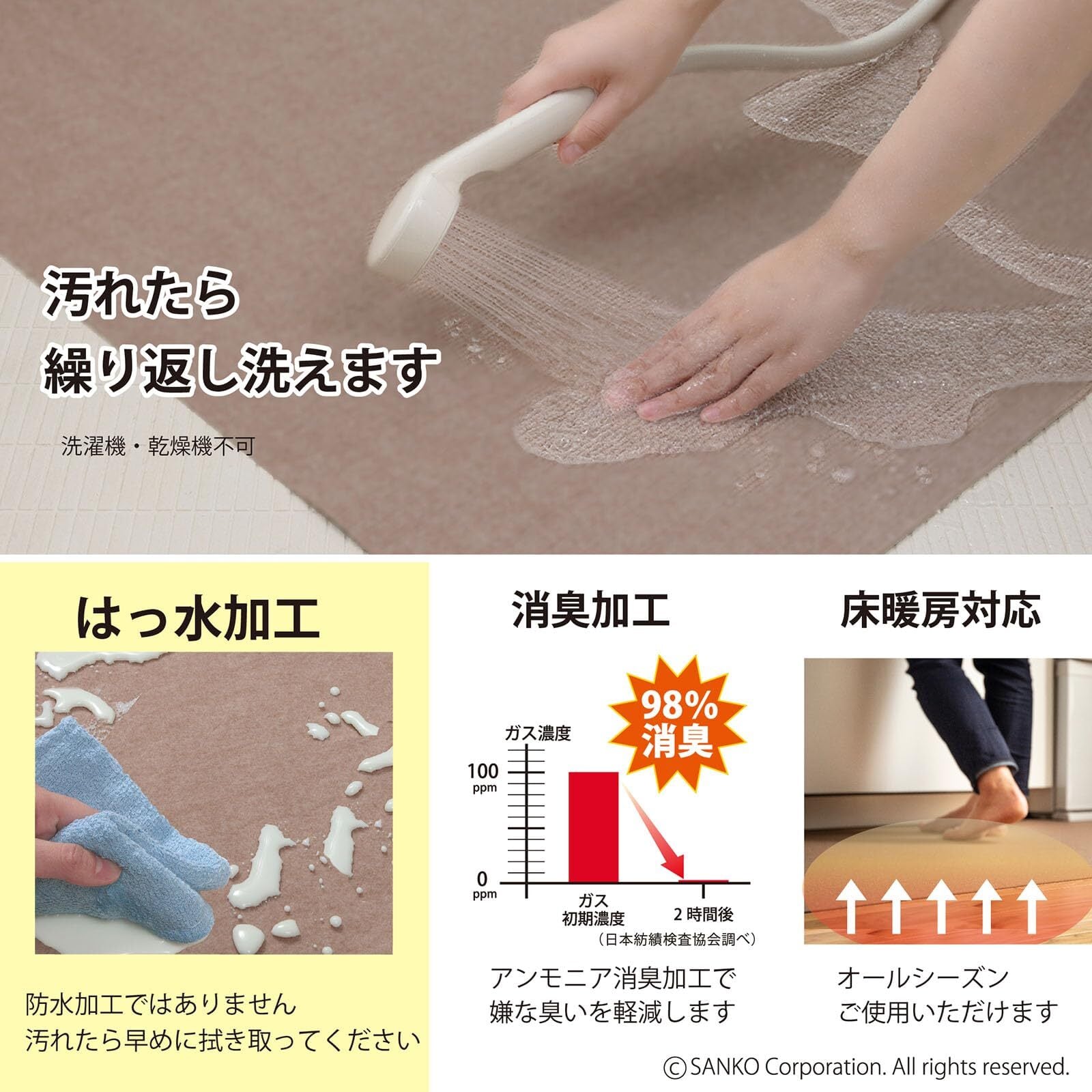 【特徴】撥水加工(防水仕様ではない)、手洗いで洗える(乾燥機不可)、カット可能、床暖房対応