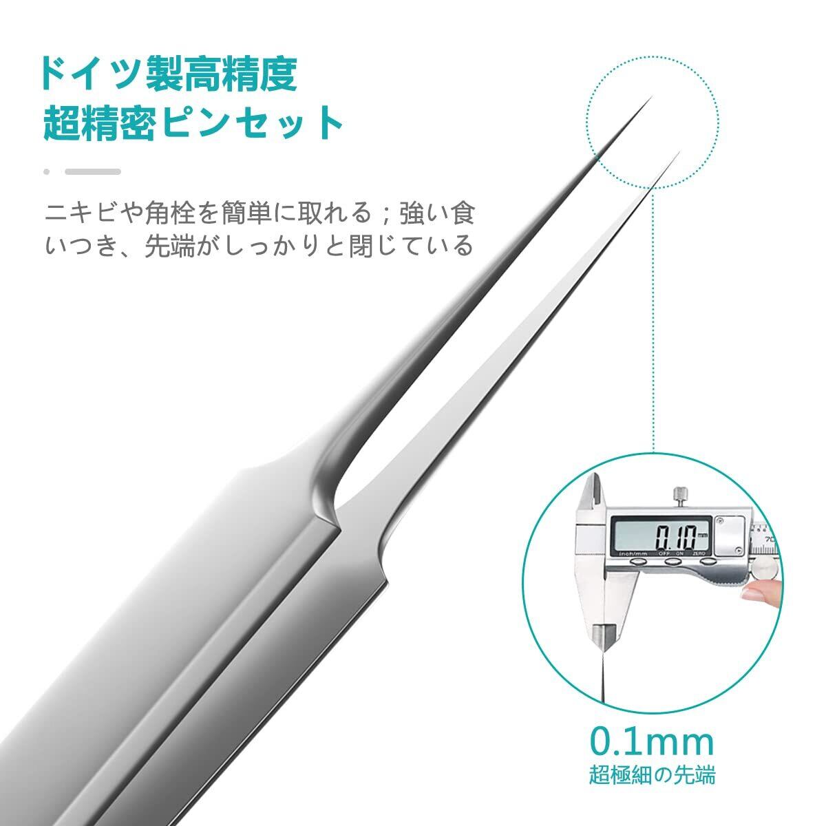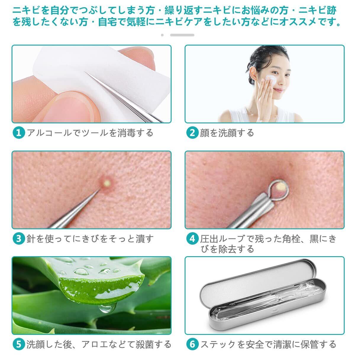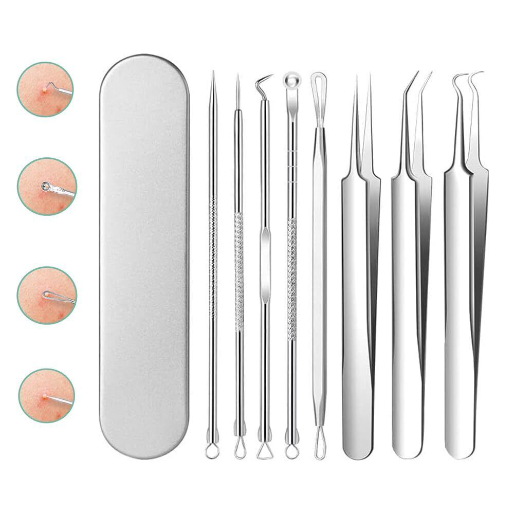 【ニキビ取りの専用キット】プロ専用の8-in-1ピンセットです。セット内容:精密先細直型ピンセット*1、精密先細斜め型ピンセット*1、精密先細曲り型ピンセット*1、フックの抜きツール・圧出ループ*1、針状の抜きツール・圧出ループ*1、 両端ループ、針状の抜きツール+圧出ループ、大きいループ+細いループ、収納ボックス*1。さまざまな角度や形状の工具を使用できます。しつこい角栓取り除きにくいところでも対応したすいです。色々な用途に適しています。ニキビ取りツールは主に毛.、穴の角栓、ニキビ、いちご鼻、鼻の黒ずみなどの除去に向いています。