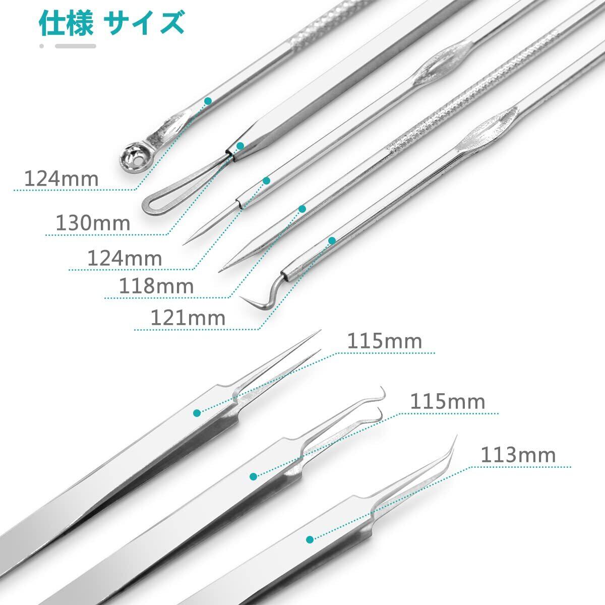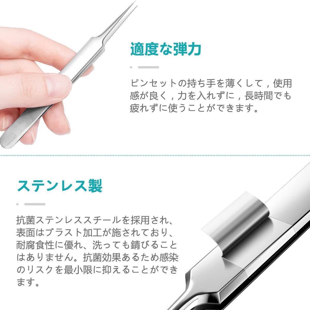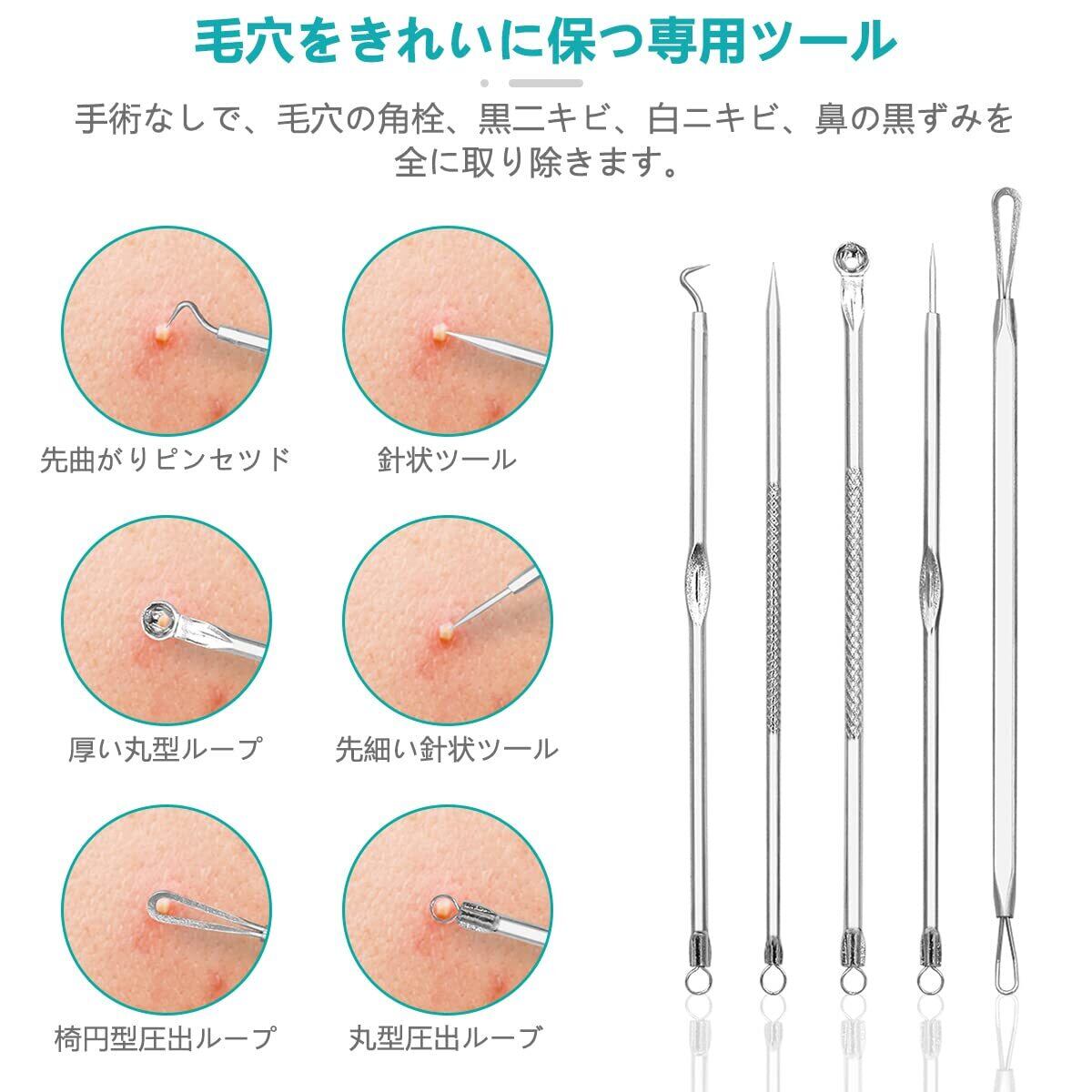 【ニキビ取りの専用キット】プロ専用の8-in-1ピンセットです。セット内容:精密先細直型ピンセット*1、精密先細斜め型ピンセット*1、精密先細曲り型ピンセット*1、フックの抜きツール・圧出ループ*1、針状の抜きツール・圧出ループ*1、 両端ループ、針状の抜きツール+圧出ループ、大きいループ+細いループ、収納ボックス*1。さまざまな角度や形状の工具を使用できます。しつこい角栓取り除きにくいところでも対応したすいです。色々な用途に適しています。ニキビ取りツールは主に毛.、穴の角栓、ニキビ、いちご鼻、鼻の黒ずみなどの除去に向いています。