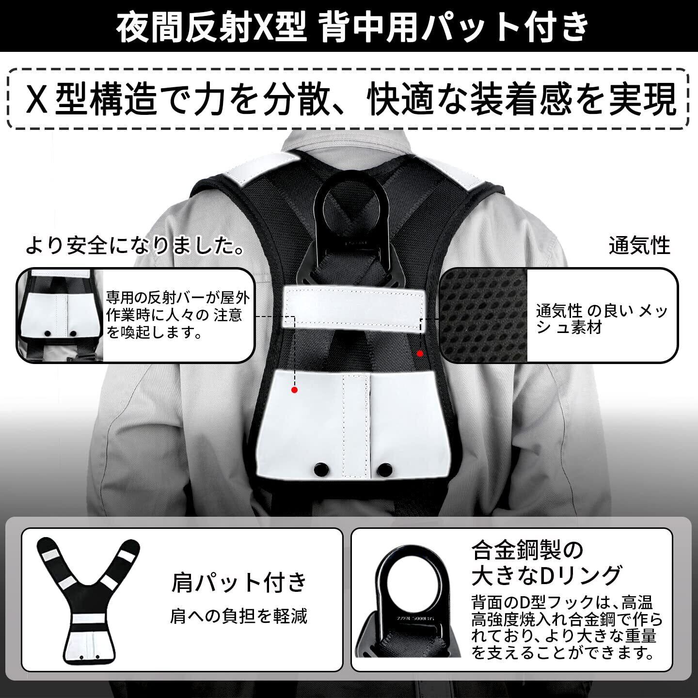 【安全性を高めるための緻密な耐力設計】安全帯の背面にはX字型設計を採用し、背面のDリングによって生み出される引っ張る力を効果的に分散させながら締め付けをやわらげ、安全帯をより体にフィットさせることができます。また、通気性のある素材で作られた反射ショルダーパッドは夜間に作業者の位置をはっきり示し、安全性を高めます!