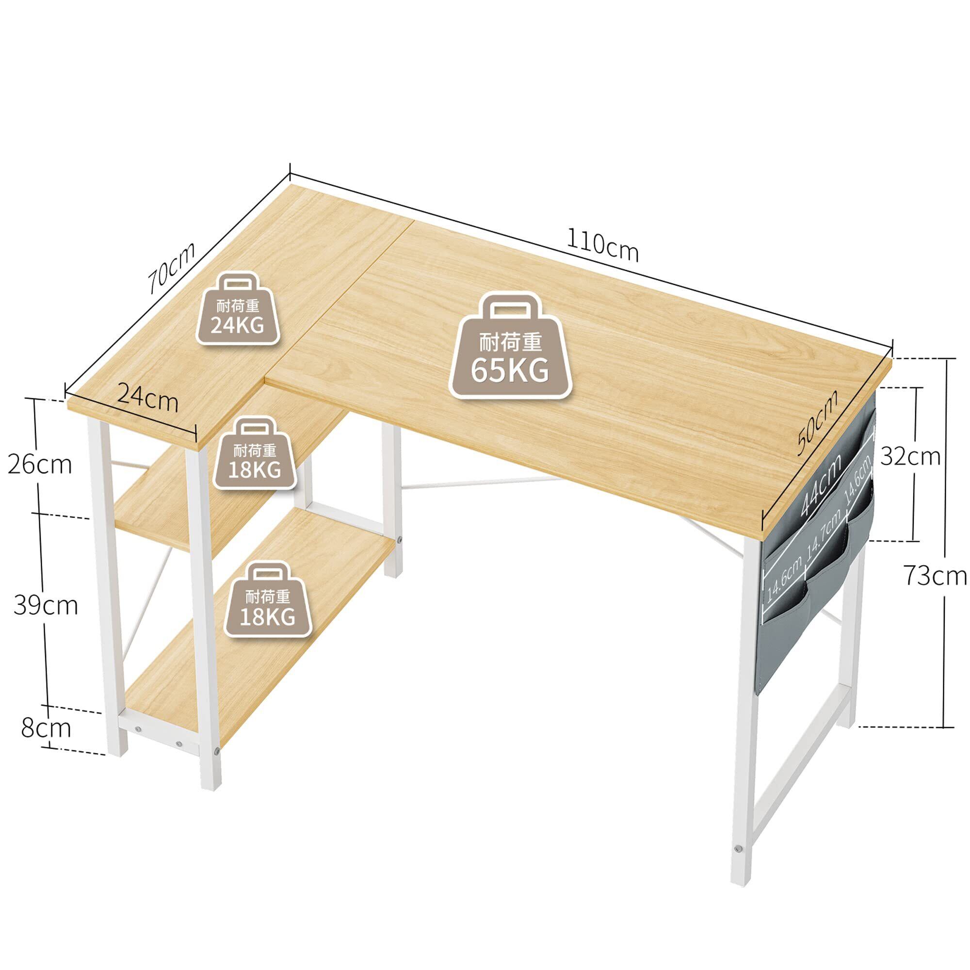 【商品仕様】省スペースのためにラック付きのl字デスク。◆本体サイズ:幅110×奥行70×高さ73CM ◆耐荷重65kg ◆お客様組立て品です