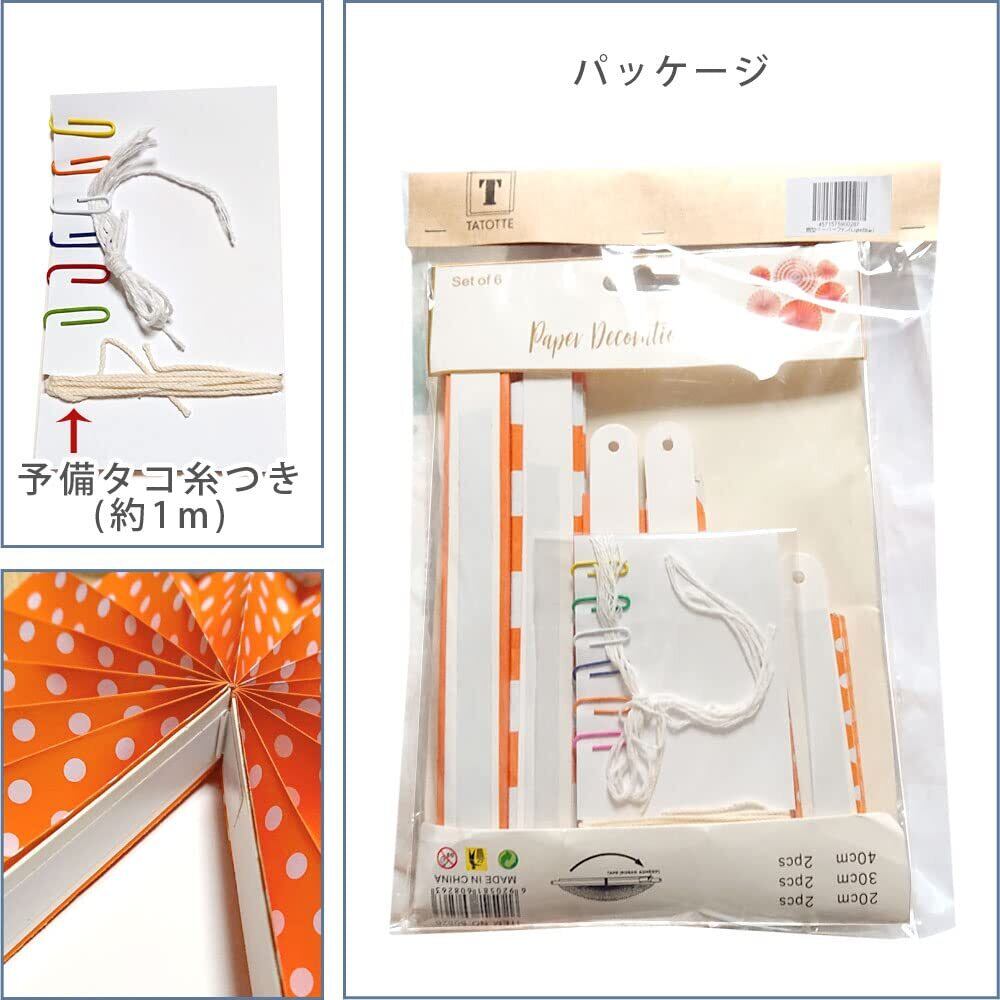 【サイズ】S (直径約20cm)×2 / M (直径約30cm)×2 / L (直径約40cm)×2 【付属品】ペーパーファン×6 / 吊り紐×6 : 予備タコ糸 (約1m)×1 / カラークリップ×6
