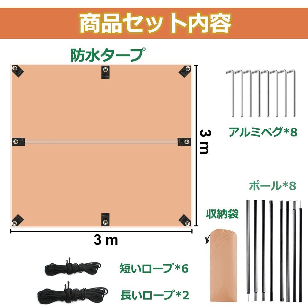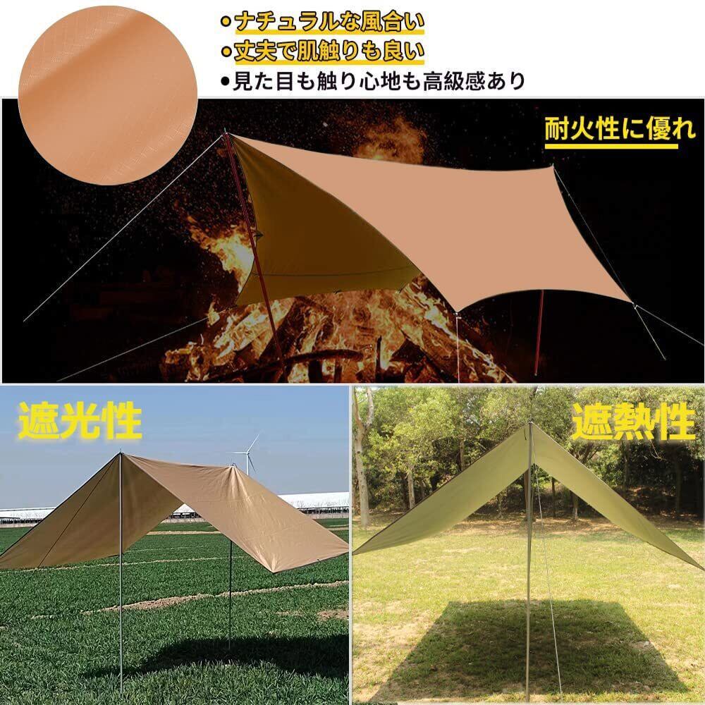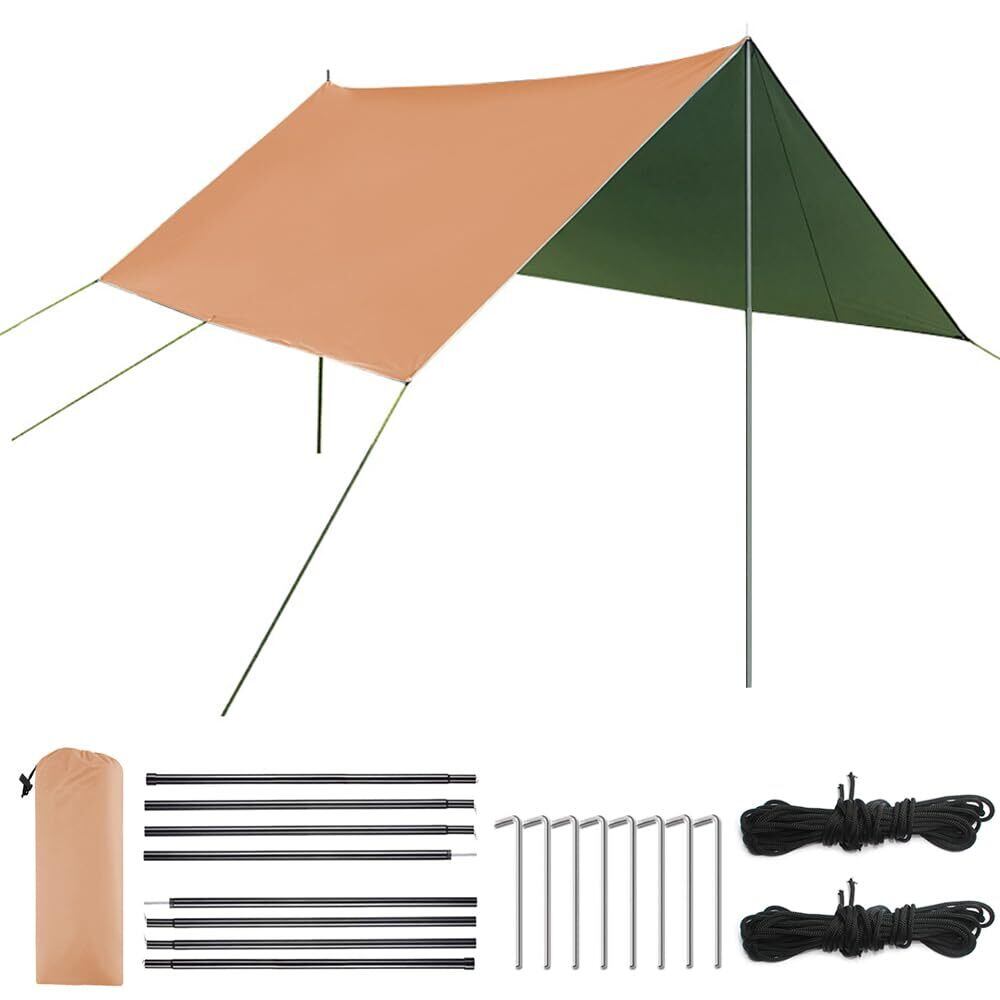 タープ キャンプテント 日除けシェード 防水タープ 天幕 アウトドア タープ ポール付き 紫外線カット サンシェルター 遮熱 遮光 収納袋付き 多機能 軽量 キャンプ用品 2-6人用 3×3m(カーキ)