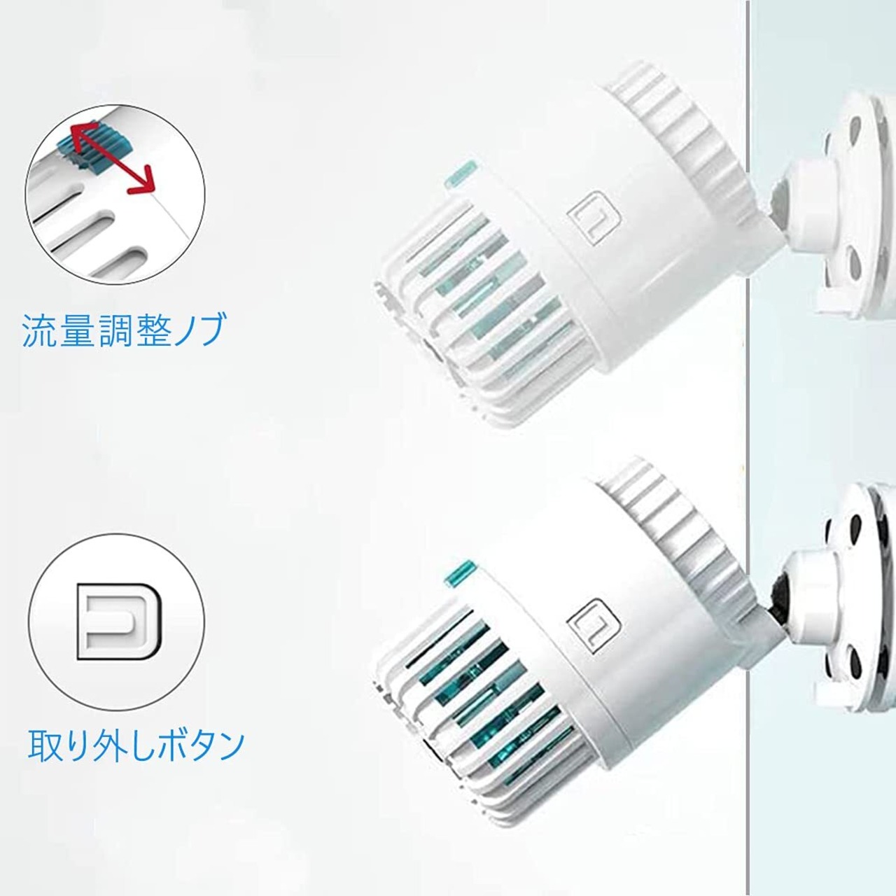 【流量調整&回転可能&二重出口】流量調整機能が付いています。流量調整ノブで三段階流量を調整できます。二つの出口は、それぞれの出口で流量の大きさを制御できます。ご使用の場面によって適当な流量を選べます。363°回転ができます、ご必要の方向で水流の方向は調整可能です。水槽内で自然界の水中のような水流を実現できます。