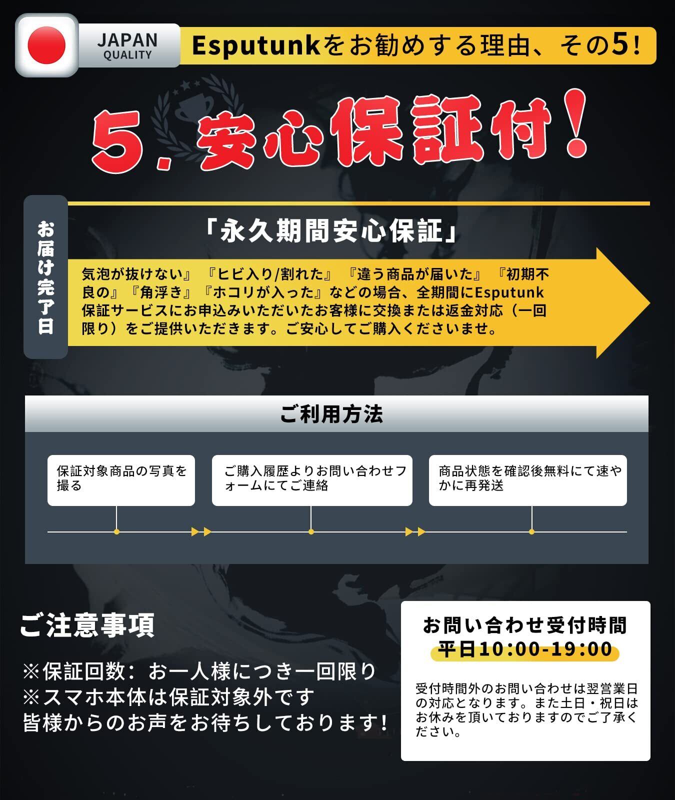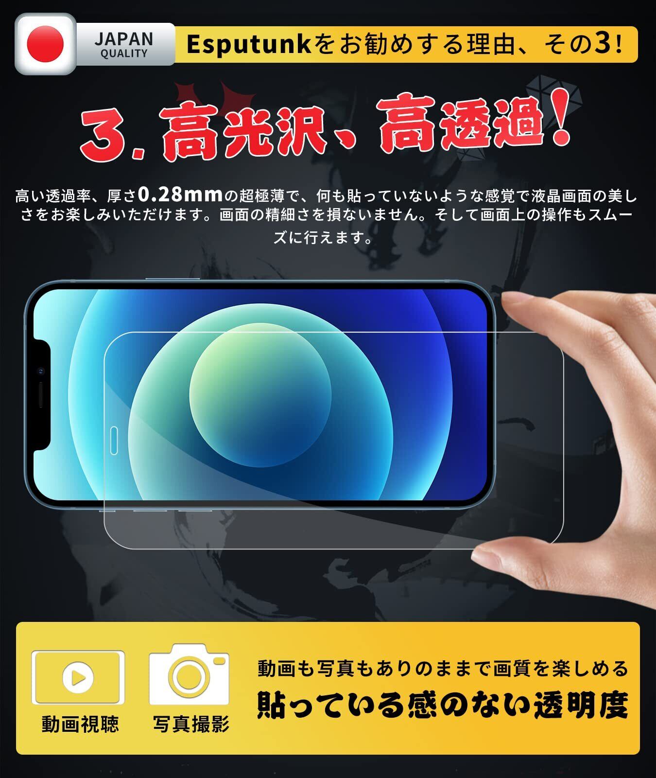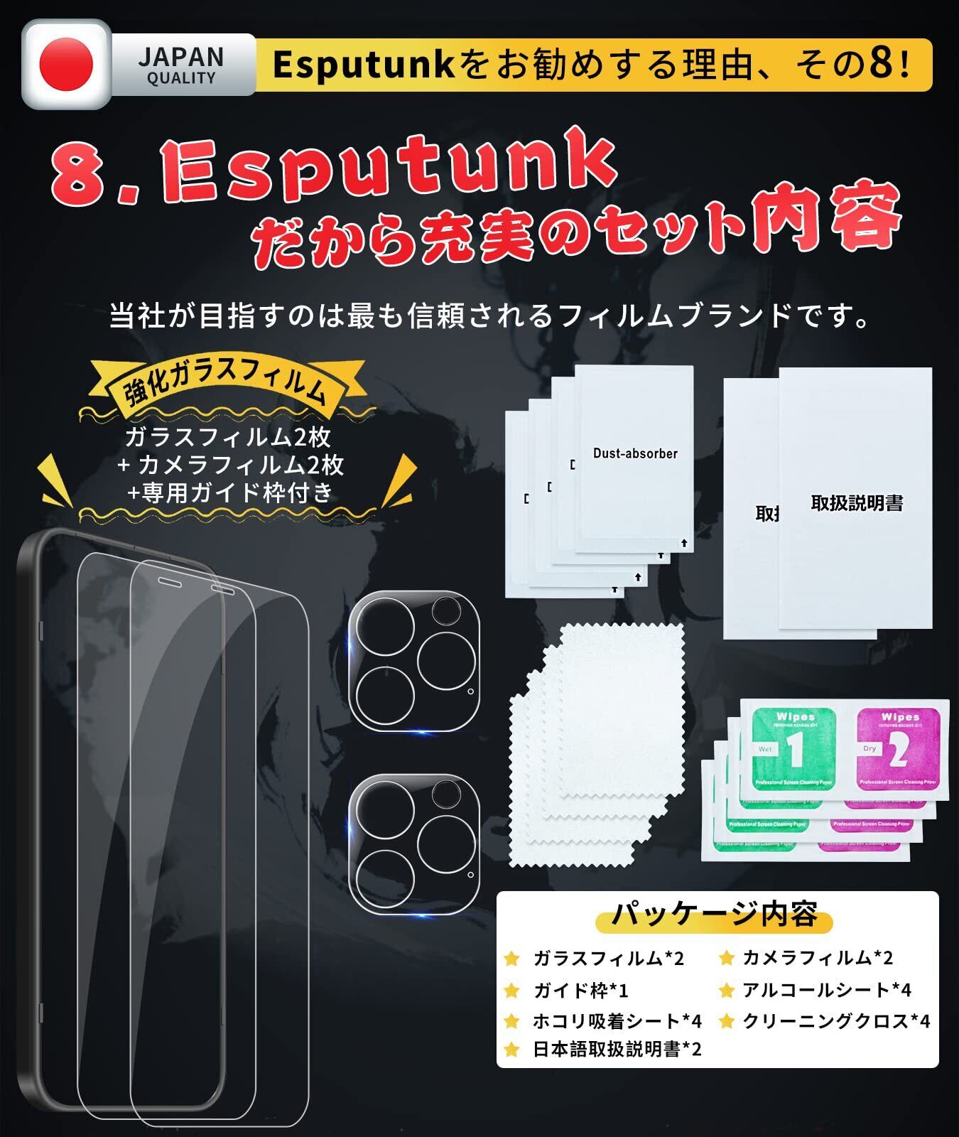 必ずお読みください「注意喚起」本製品は【iPhone12 Pro対応ガラスフィルム+カメラフィルム+ガイド枠】4枚セットです。全面保護を提供いただき、別に買うために行く必要はございません。ご希望の数は在庫数上の場合はどうぞ弊店にてお問い合わせください。【Esputunk製品保証の概要】:永久保証について、製品に不具合が生じた場合は、お客様からのお問い合わせ内容に応じて代替品交換・返金対応を提供致します。(お一人様につき1回限り)