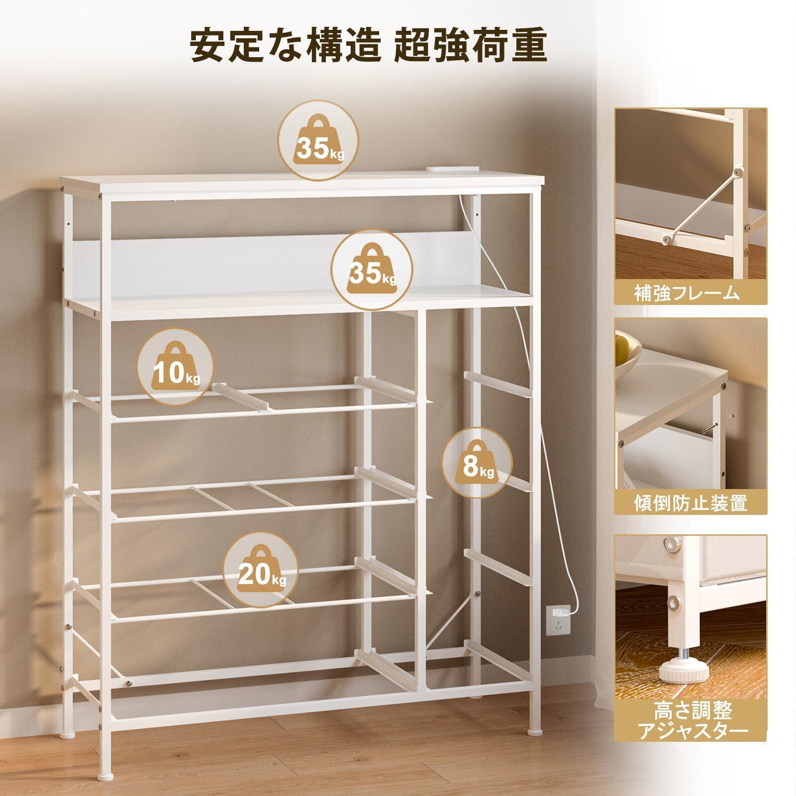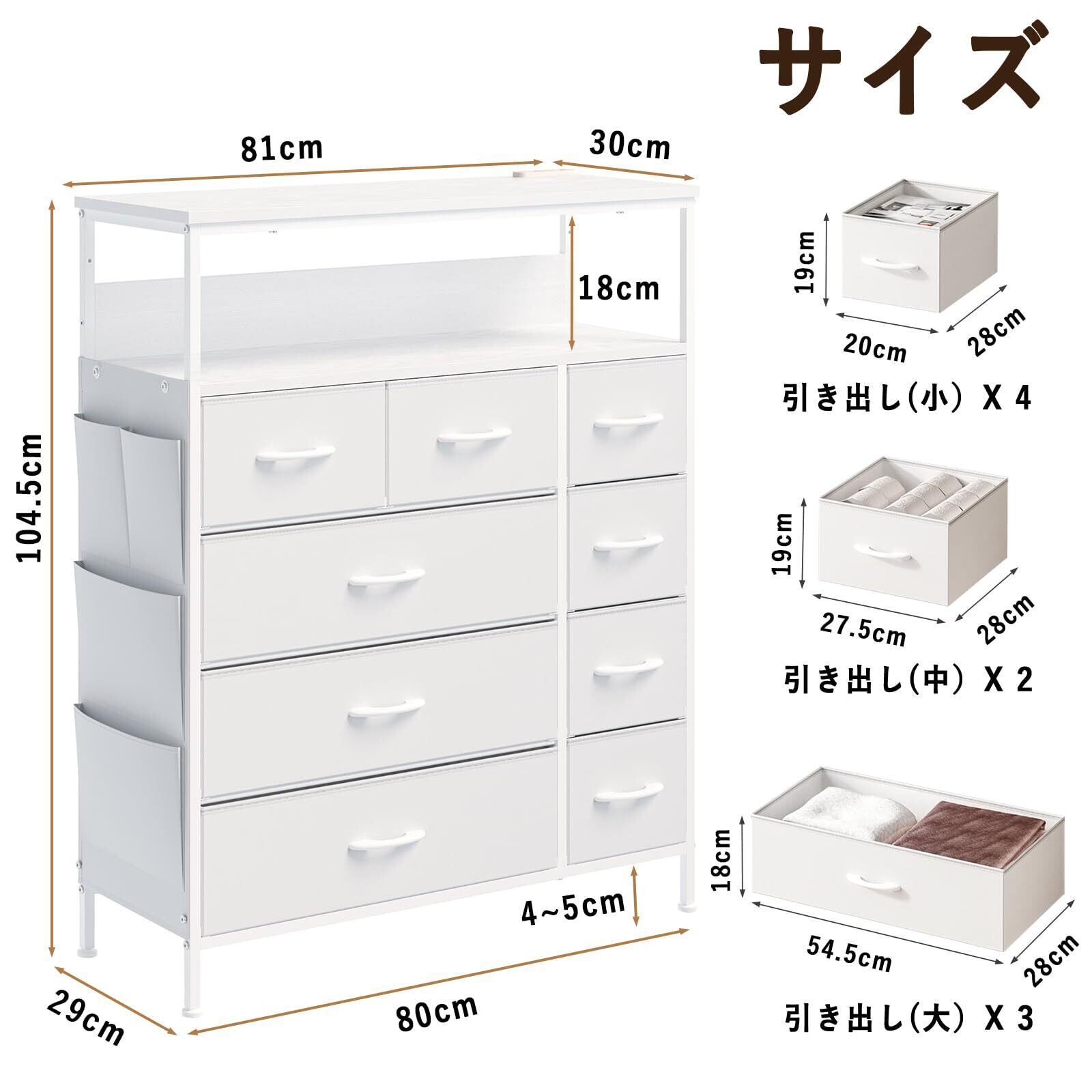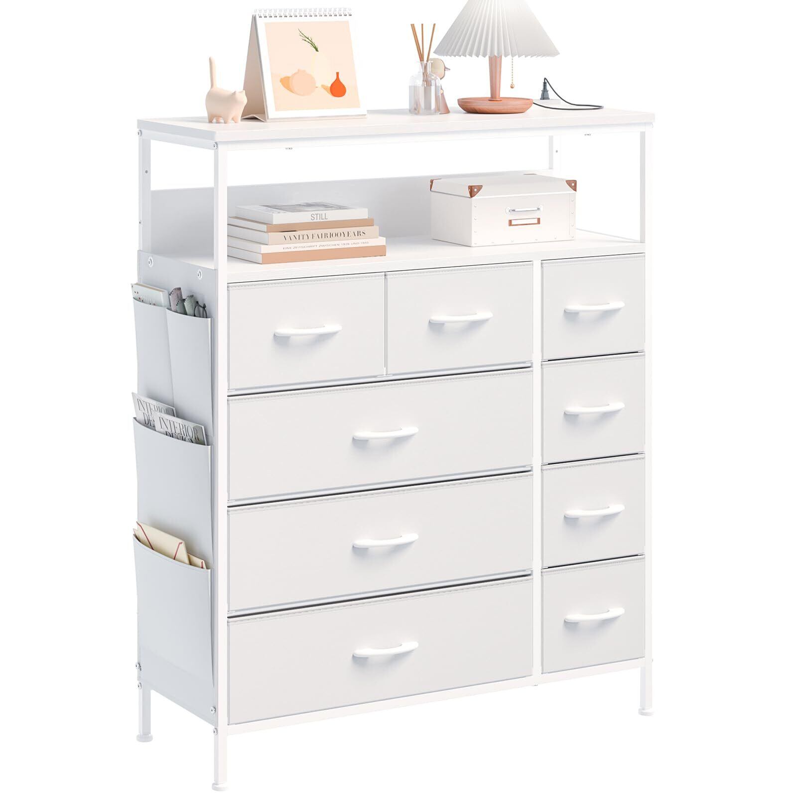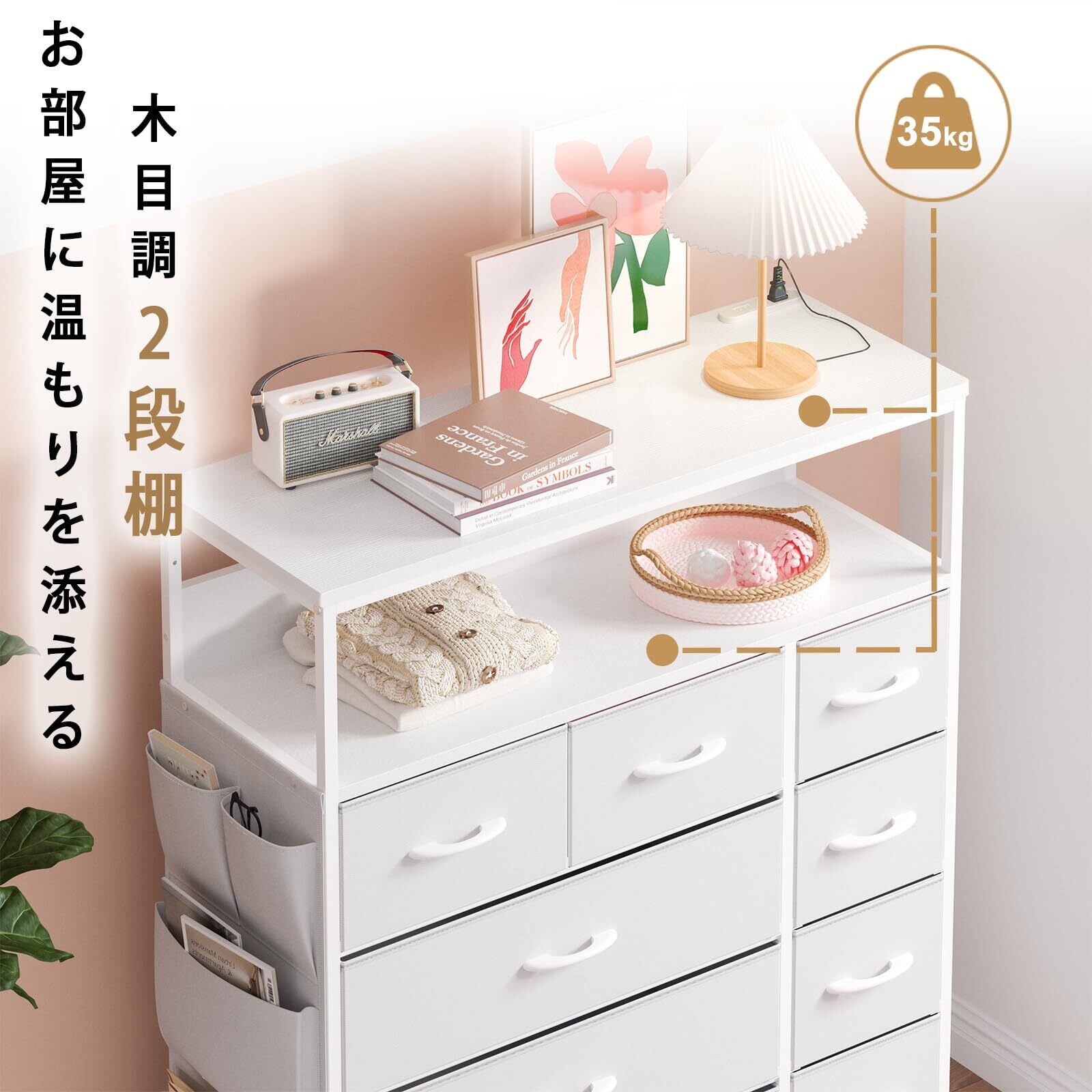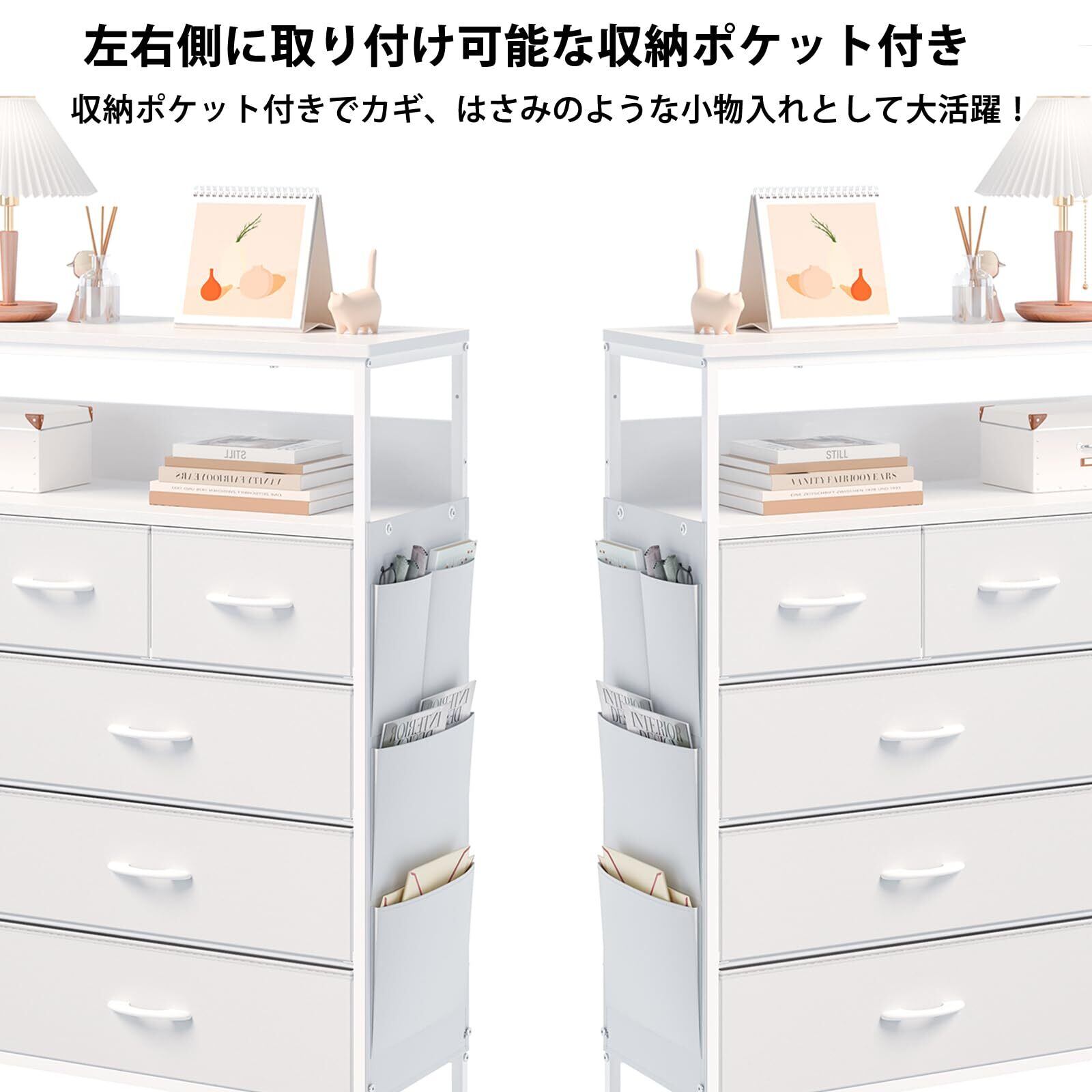 2口コンセント&2段棚 チェスト タンス 側面収納ポケット 衣装ケース 収納棚 洋服 衣類 収納 箪笥 おしゃれ キャビネット ハイチェスト リビング ランドリーチェスト 脱衣所 布製引き出し 整理タンス マルチチェスト(高防水性皮革 ホワイト)