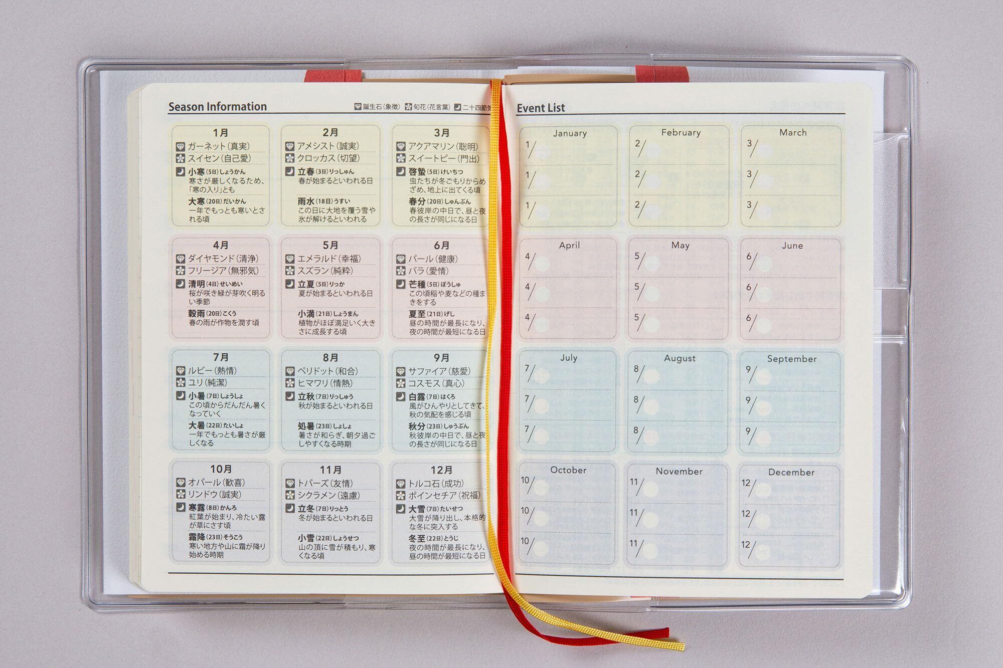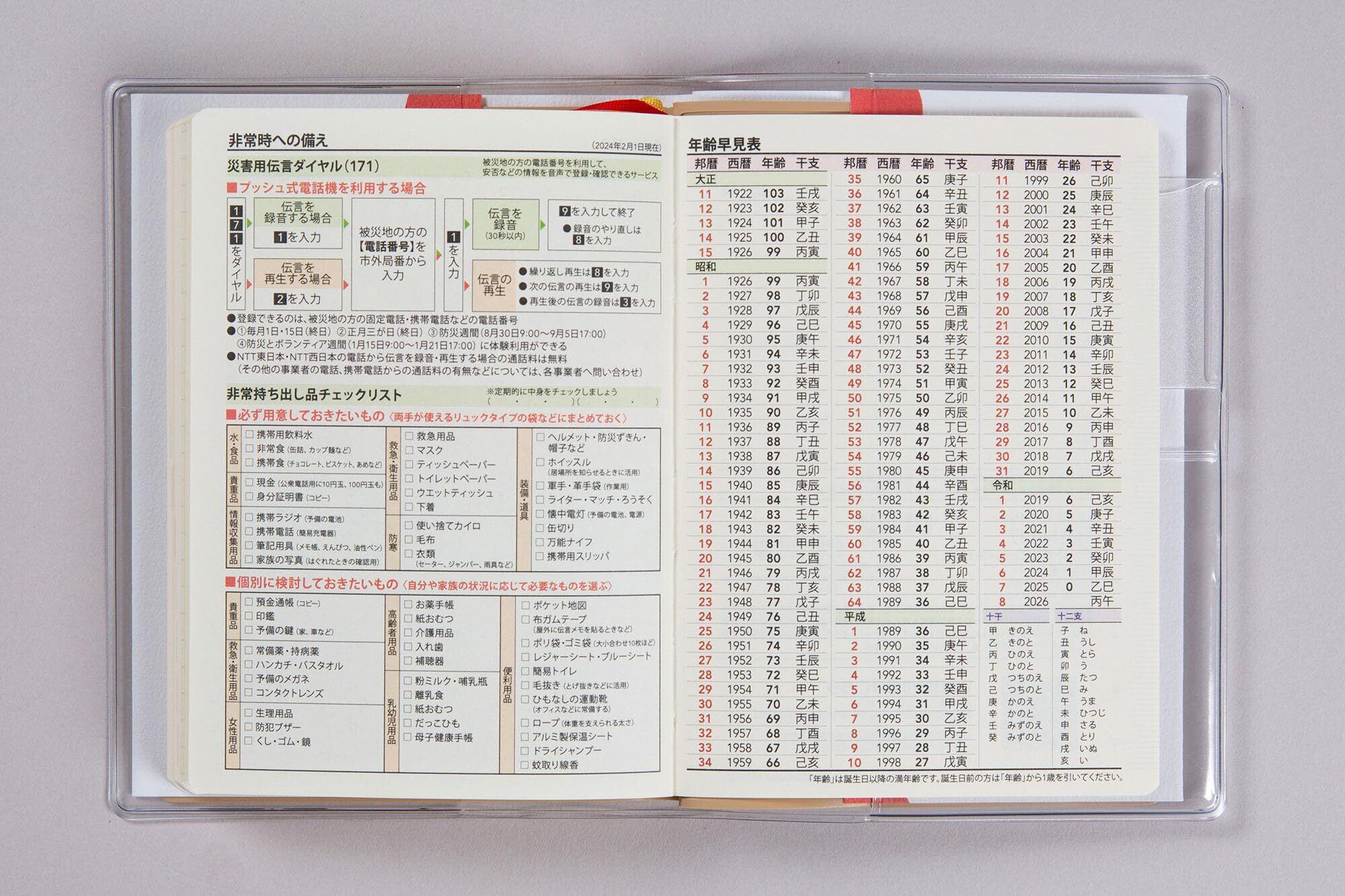 【商品詳細2】表紙タイプ:クリアカバー ●刷色:2色刷 ●ページ数:272頁 ●スペック:ペンホルダー ●付録:年齢早見表,非常時への備え,イベントリスト,シーズンインフォメーション,アドレスメモ,方眼メモ ●別冊:なし