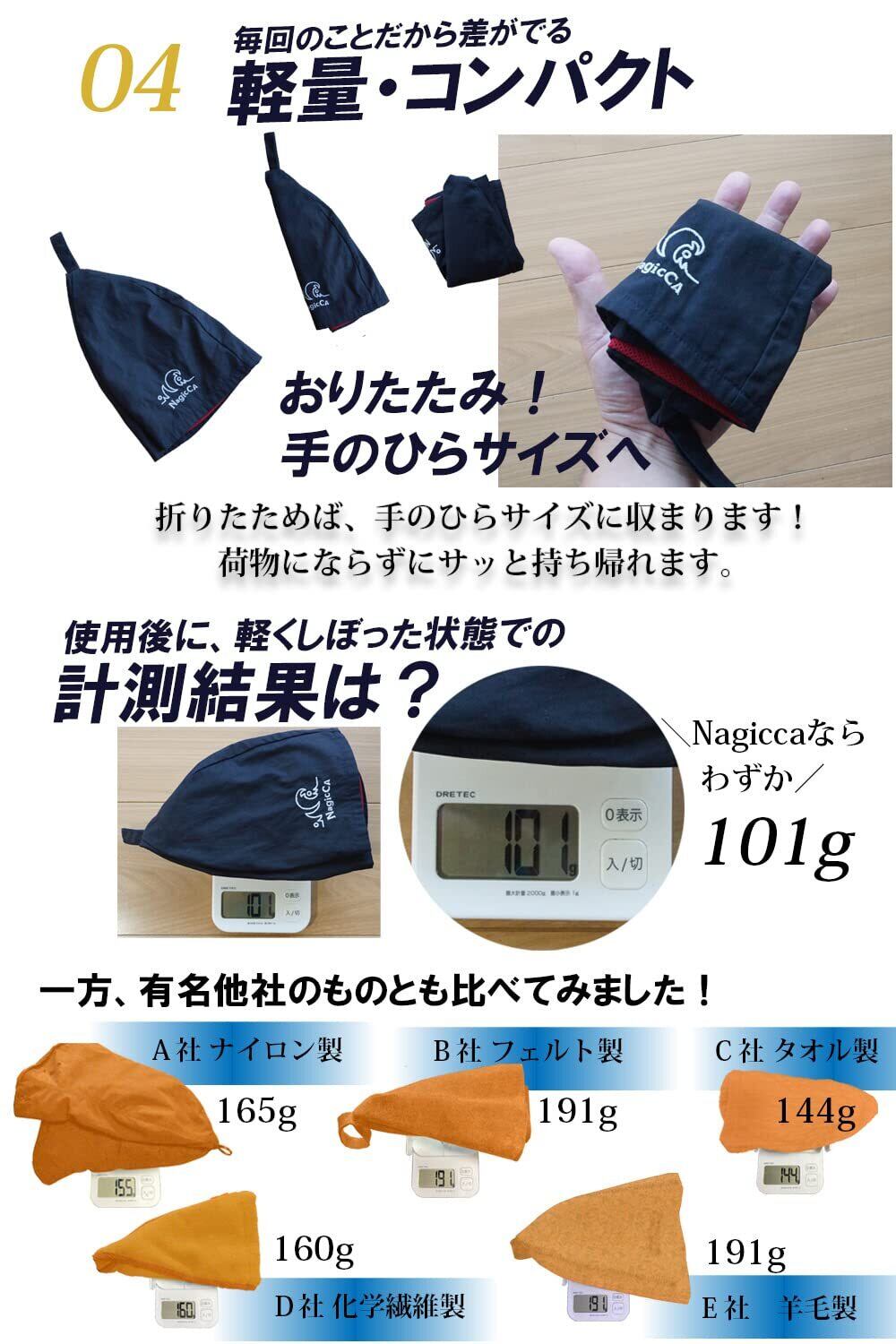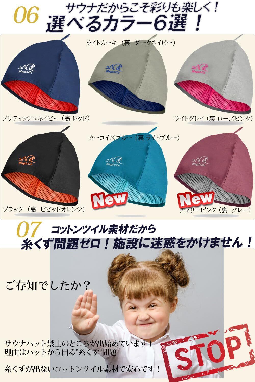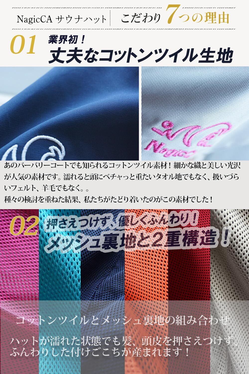 【Nagiccaサウナハットの特長と7つのこだわり】 ①業界初、高級ブランドのアウターコート素材としても知られる「コットンツイル生地」を採用!コットンツイルはきめ細かな織と美しい光沢、そしてハットにも大切な丈夫さを兼ね備えた魅力的な素材 ②メッシュ裏地との2重構造により、ハットが濡れても押さえつけずに頭皮もふんわり快適! ③吹き上げるロウリュ熱からも目元、耳たぶをきっちり守る深めのデザイン