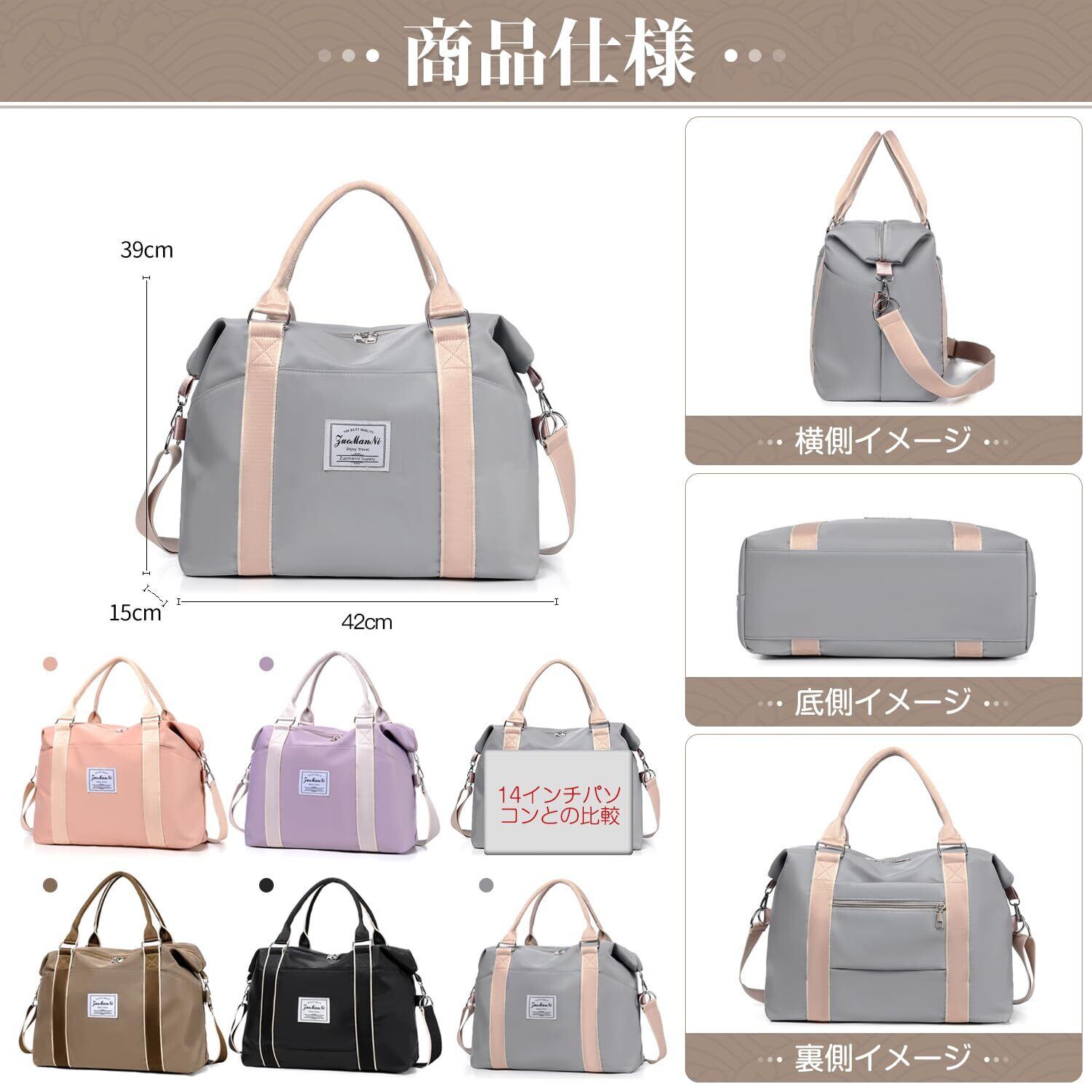 【商品仕様】約長さ42cm*幅さ15cm*高さ39cm;4WAY使い方:手提げバッグ、ショルダーバッグ、斜め掛け、スーツケース固定