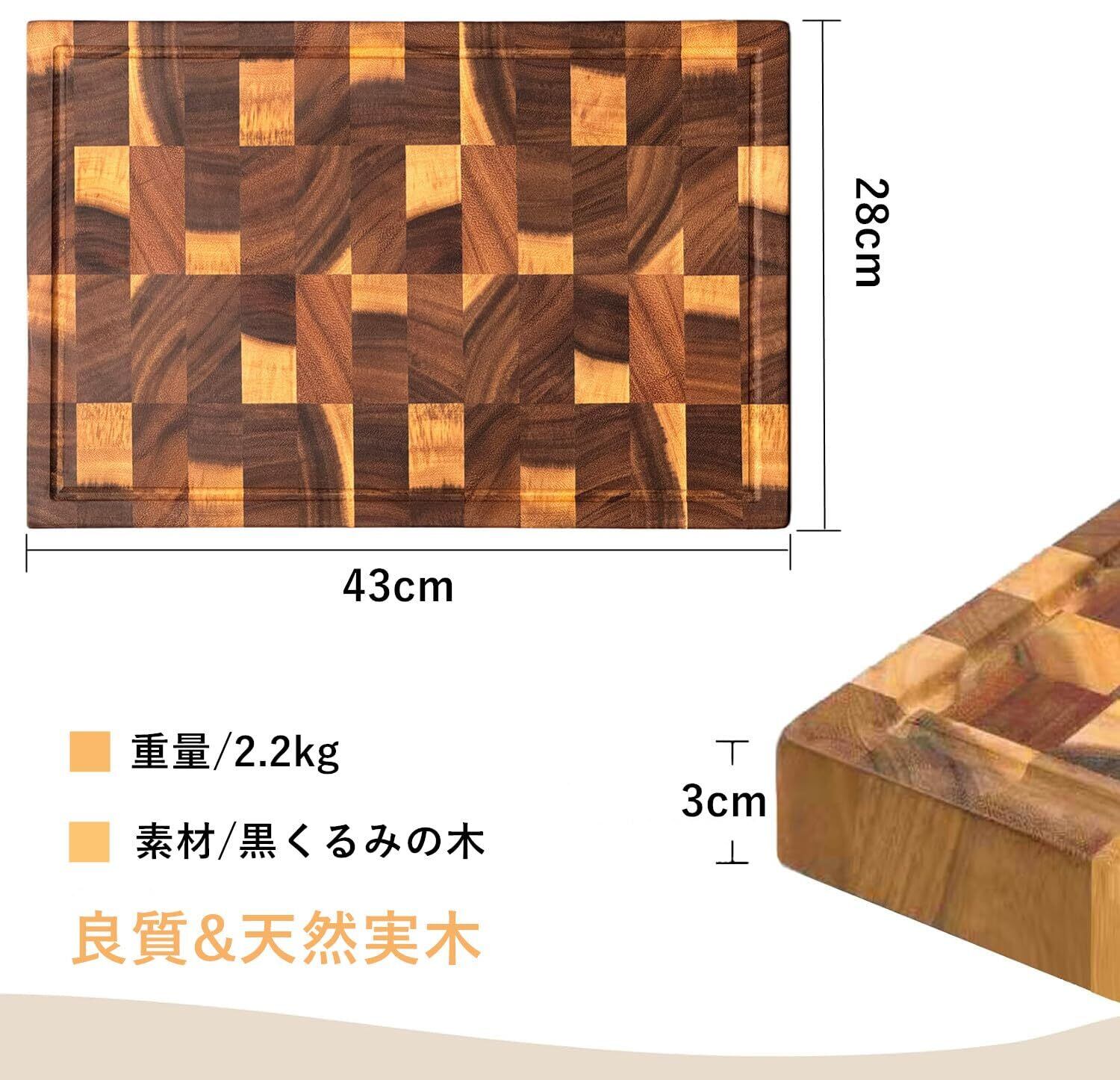 【上質なウォールナット材のまな板】ウォールナットは北米原産で、美しい天然の木目と適度な硬さで知られています。現在では優れた木材として認識されており、高い地位を確立しています。ウォールナットの特徴は割れにくい上に程よい硬さがあって非常に加工しやすい事で、塗装をしなくても表面がウォールナット特有の艶のある美しい濃い褐色がでます。そのため、見た目的にも申し分のない魅力的な木です。ウォールナットは実用的なだけでなく、「情緒のある」素材とも考えられています。 ウォールナットが好きな人にとって、それは美しさや優雅さを表現するだけでなく、高貴な感情を含んでいます。 この木材が放つ独特の魅力は人々を深く引きつけています。
