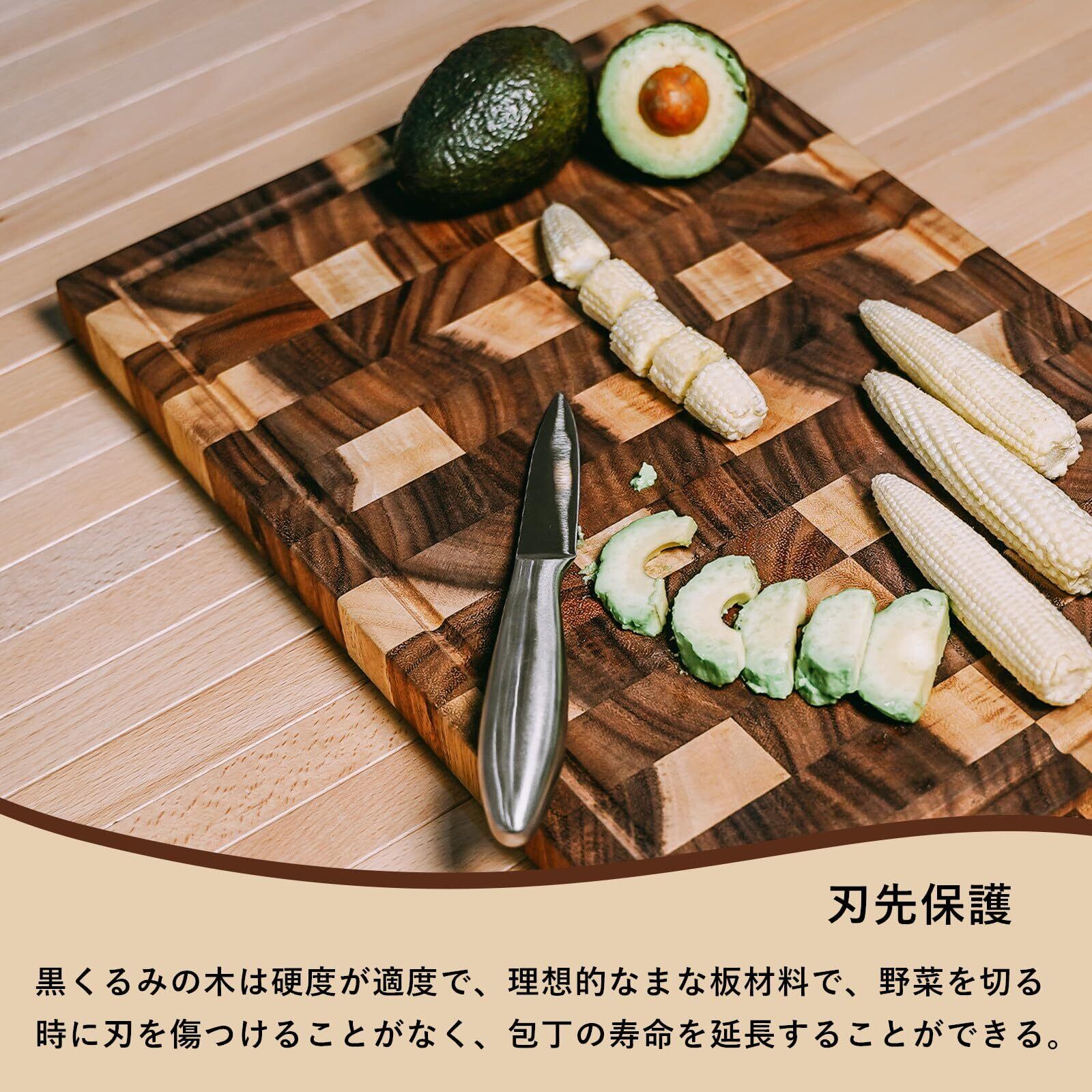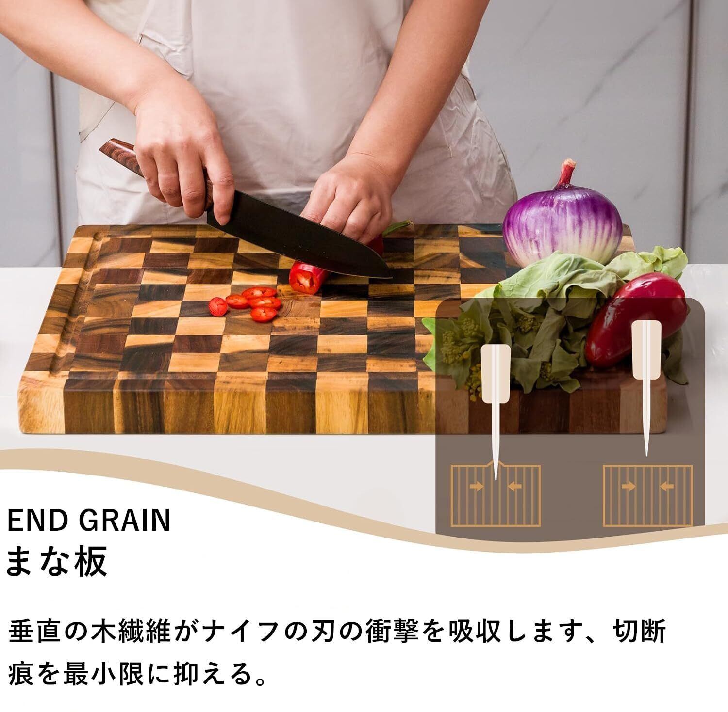 【END-GRAIN まな板】このまな板にはある程度の「自己修復機能」が備わっています。木の繊維は切った後に元の位置に戻るので、これはあなたの包丁が鈍らないように保護することもできます。