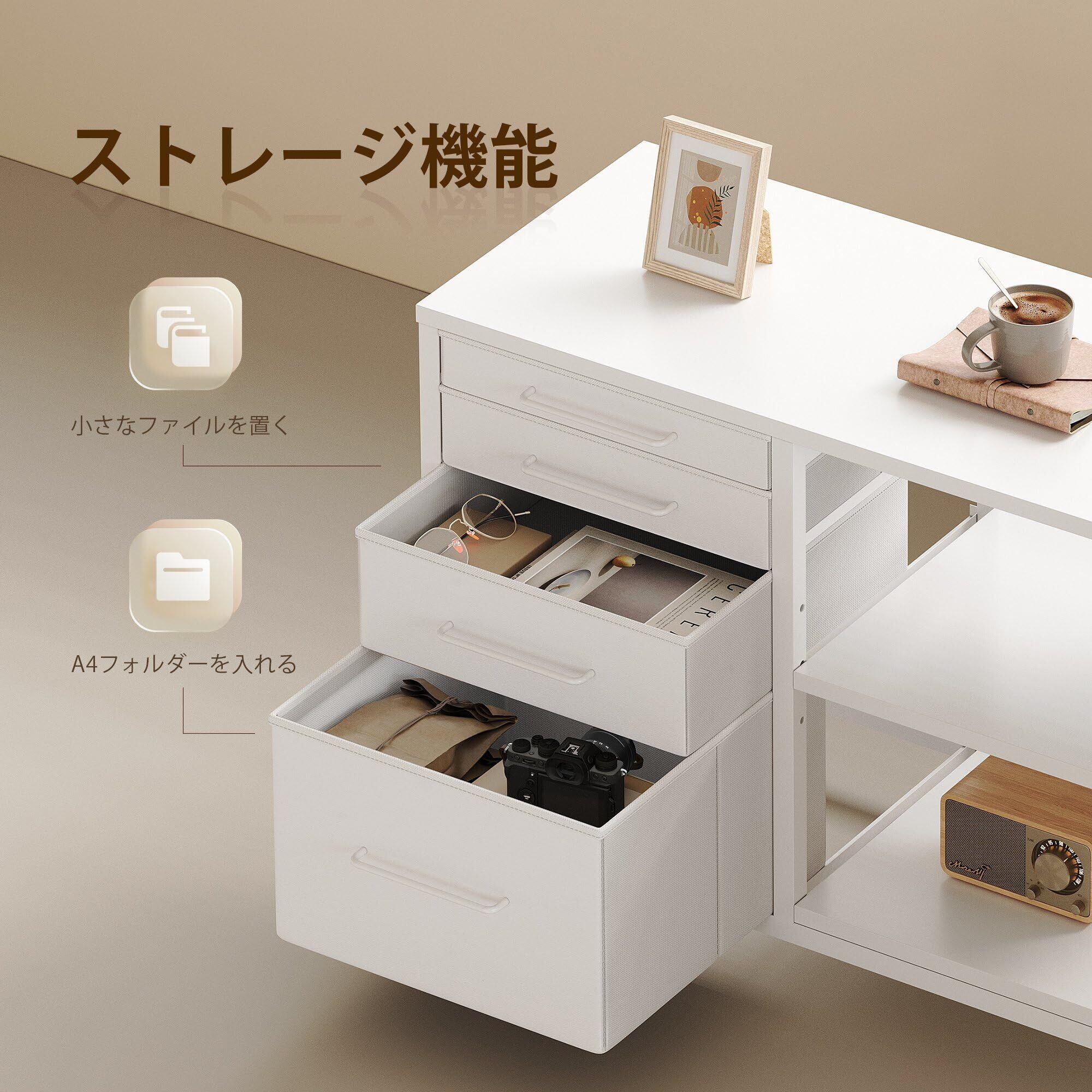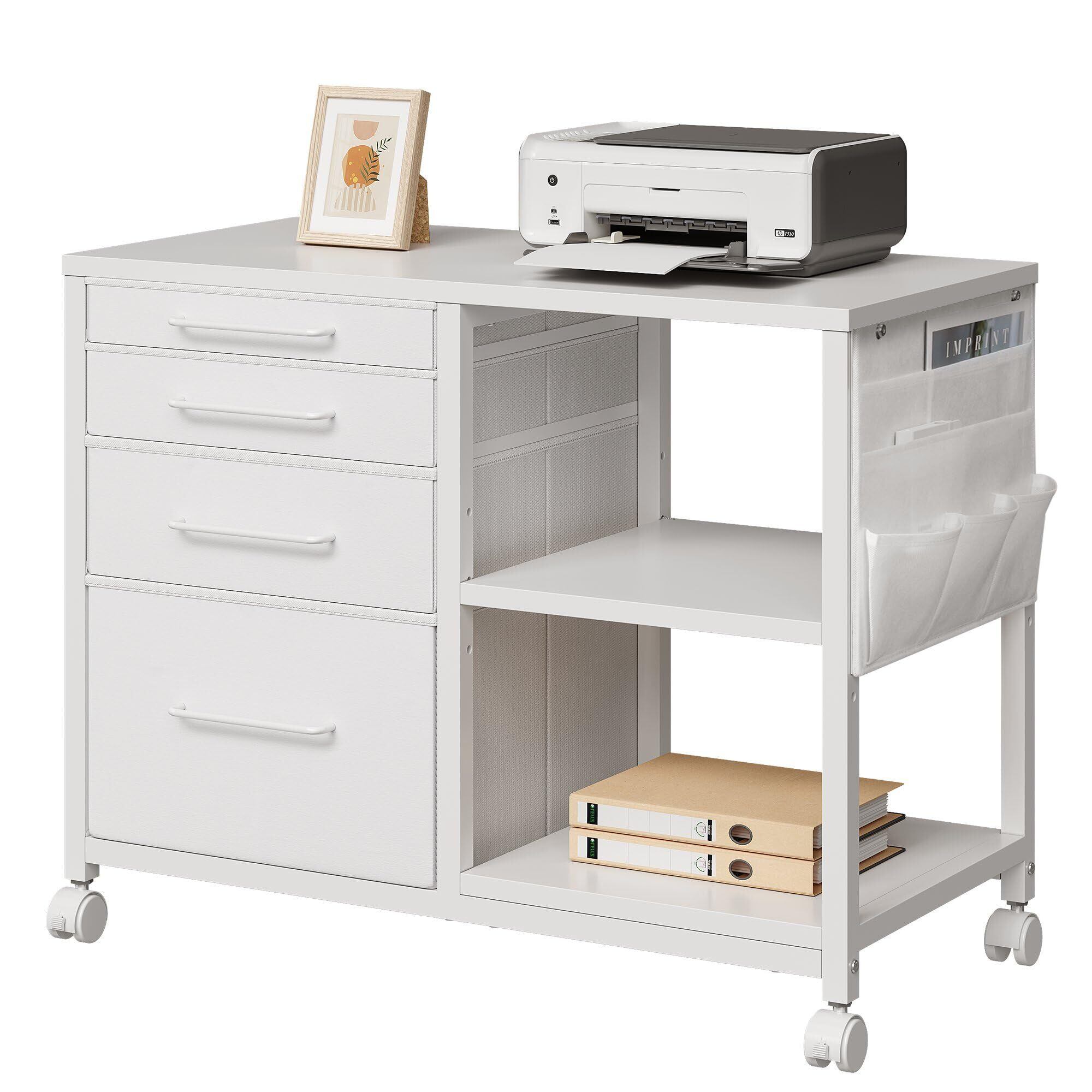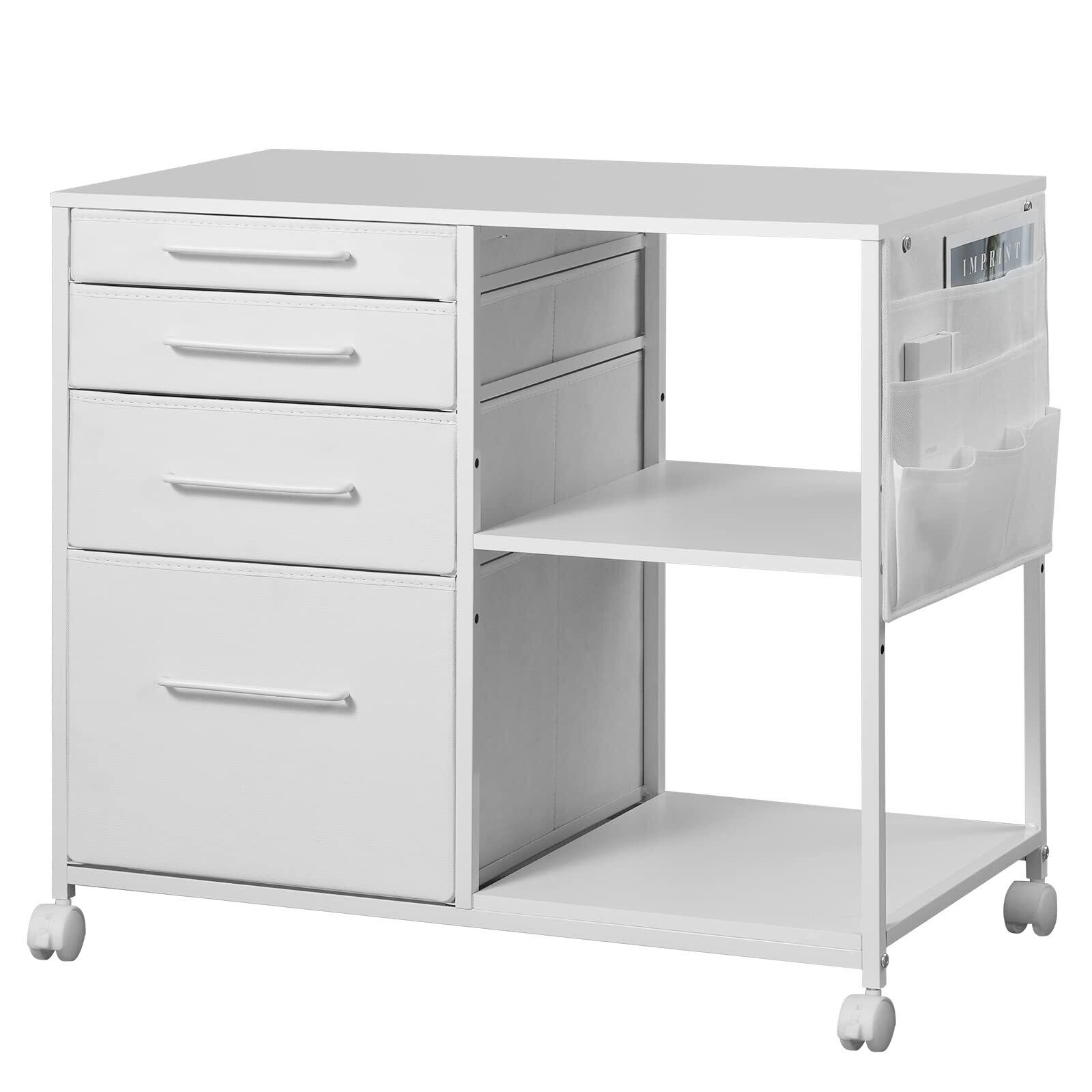 サイドキャビネット デスクワゴン 布製 袖机 層板付き サイドワゴン 4段 オフィスワゴン A4対応 プリンター台 大容量 キャスター付き デスク下収納 幅750*奥行400*高さ650mm 白い