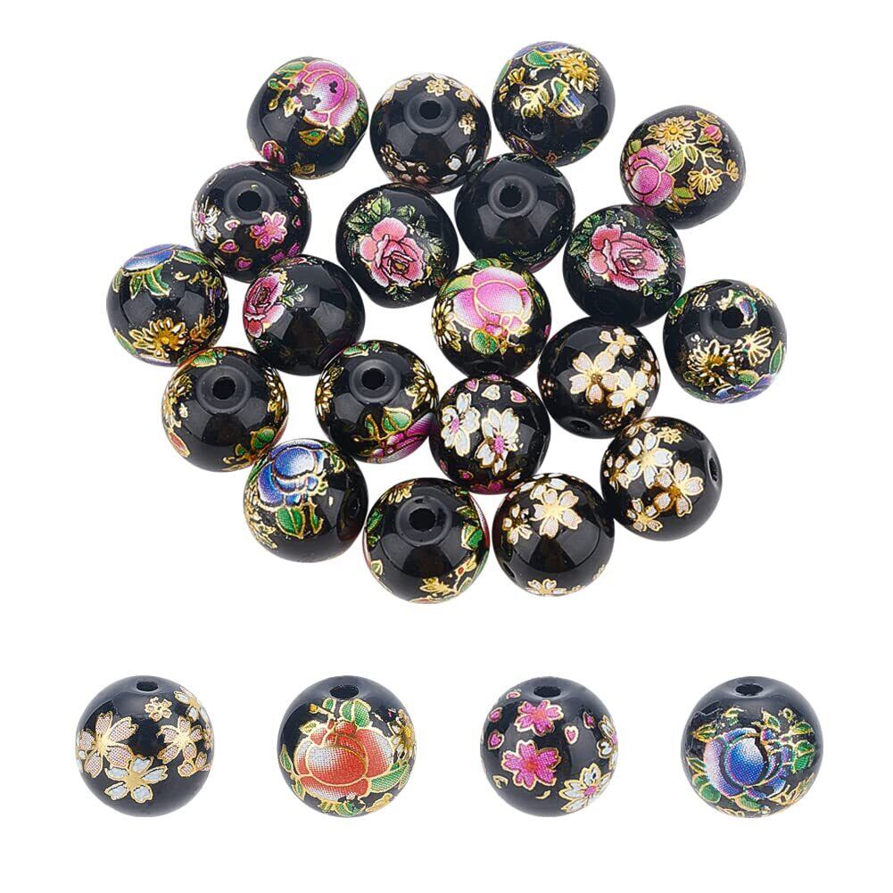 約20個 ガラスビーズ グラスビーズ 12mm ビーズ トンボ玉 花柄 和風ビーズ 桜柄 ブラック 丸玉ビーズ ラウンドビーズ とんぼ玉 ハンドメイドパーツ ブレスレット用 DIY用 手芸材料 手作り素材