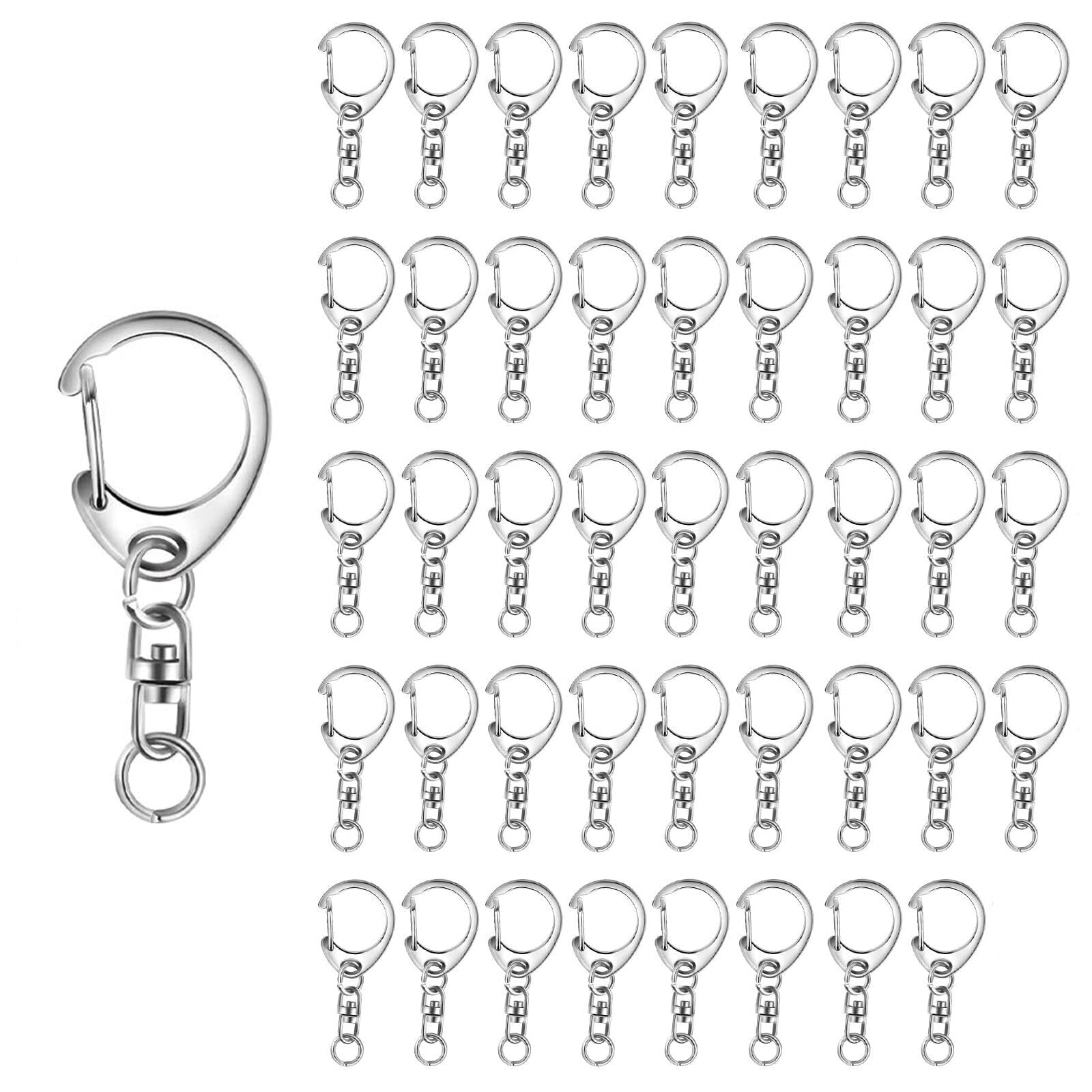 【パッケージ内容】キーホルダー金具*50個。サイズ:全長約45mm、幅約20mm、丸カン:内径6mm×線径1mm。ナスカン:(縦・外寸)約24mm、(横・外寸)約18mm。
