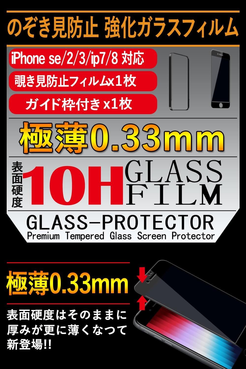 iPhone se3 ガラスフィルム覗き見防止 iPhone se2 フィルム のぞき見防止 iPhone8/7 ガラスフィルム覗き見防止【秒で貼り付け/ガイド枠付き/指紋防止 ケースに干渉しない】日本旭硝子素材製 硬度10H 耐衝撃 強化保護フィルムのぞき見防止 アイフォンSE3/アイフォン SE2/あいふおん 8/7 フィルム 覗き見防止 -4.7インチ(ブラック)