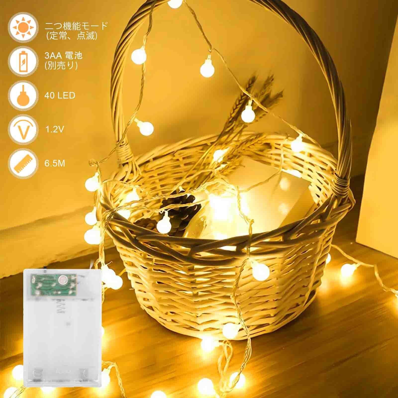 LEDイルミネーションライト電飾6.5M 40個 フェアリー 電池式 おしゃれ ガーデン ストリング 屋外 防水 防塵 クリスマス 部屋・アウトドア・テント・誕生日・結婚式・庭・パーティー 飾り (電球色)