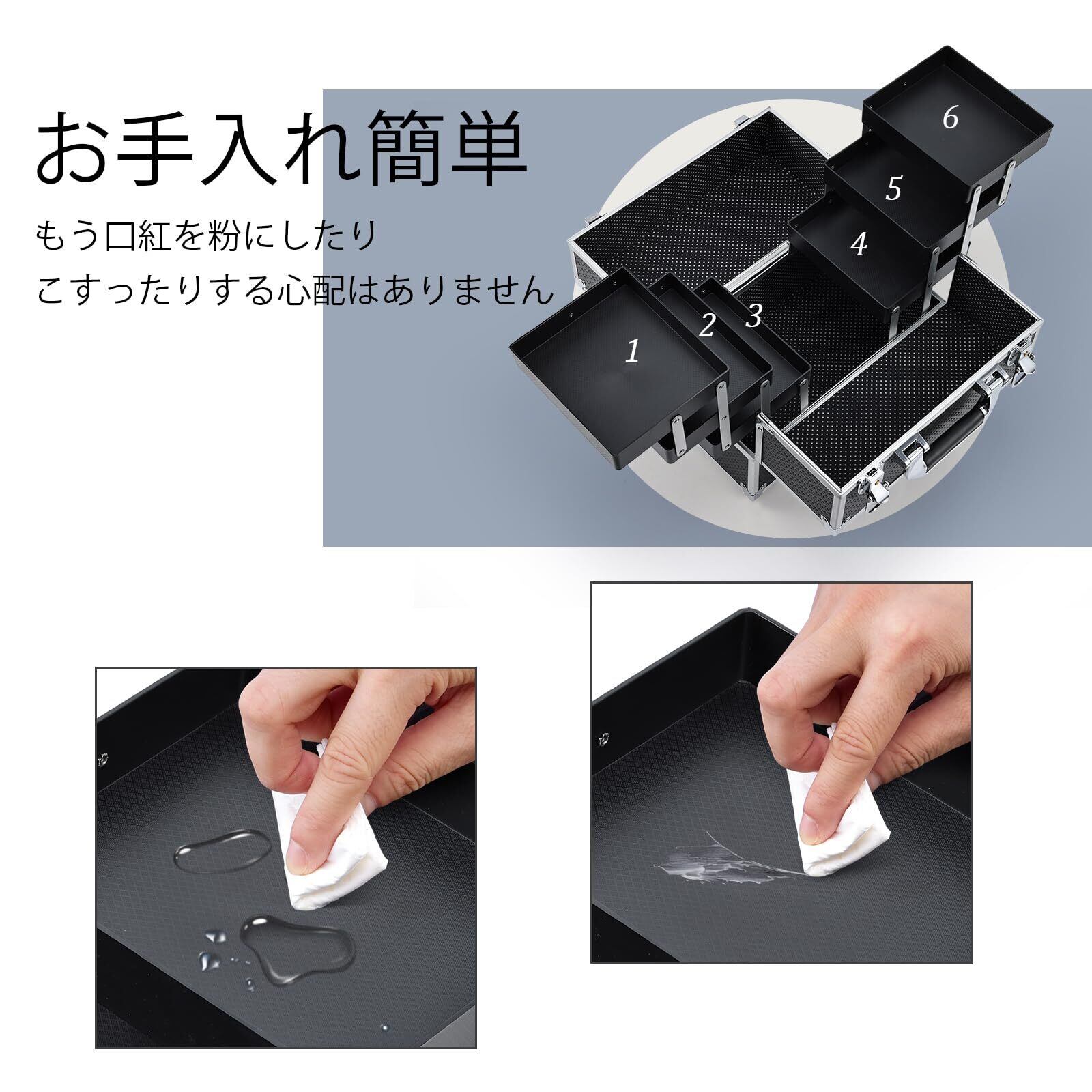 【簡単清潔】make up boxの表面は撥水性があるPVC素材を採用し、収納トレイにPVCペーパーなどを敷いておいて、うっかり化粧水などの水分をこぼしても、泥汚れもさっと拭くだけで落ちとすできるのでお手入れが簡単。綺麗にお使いいただけます。