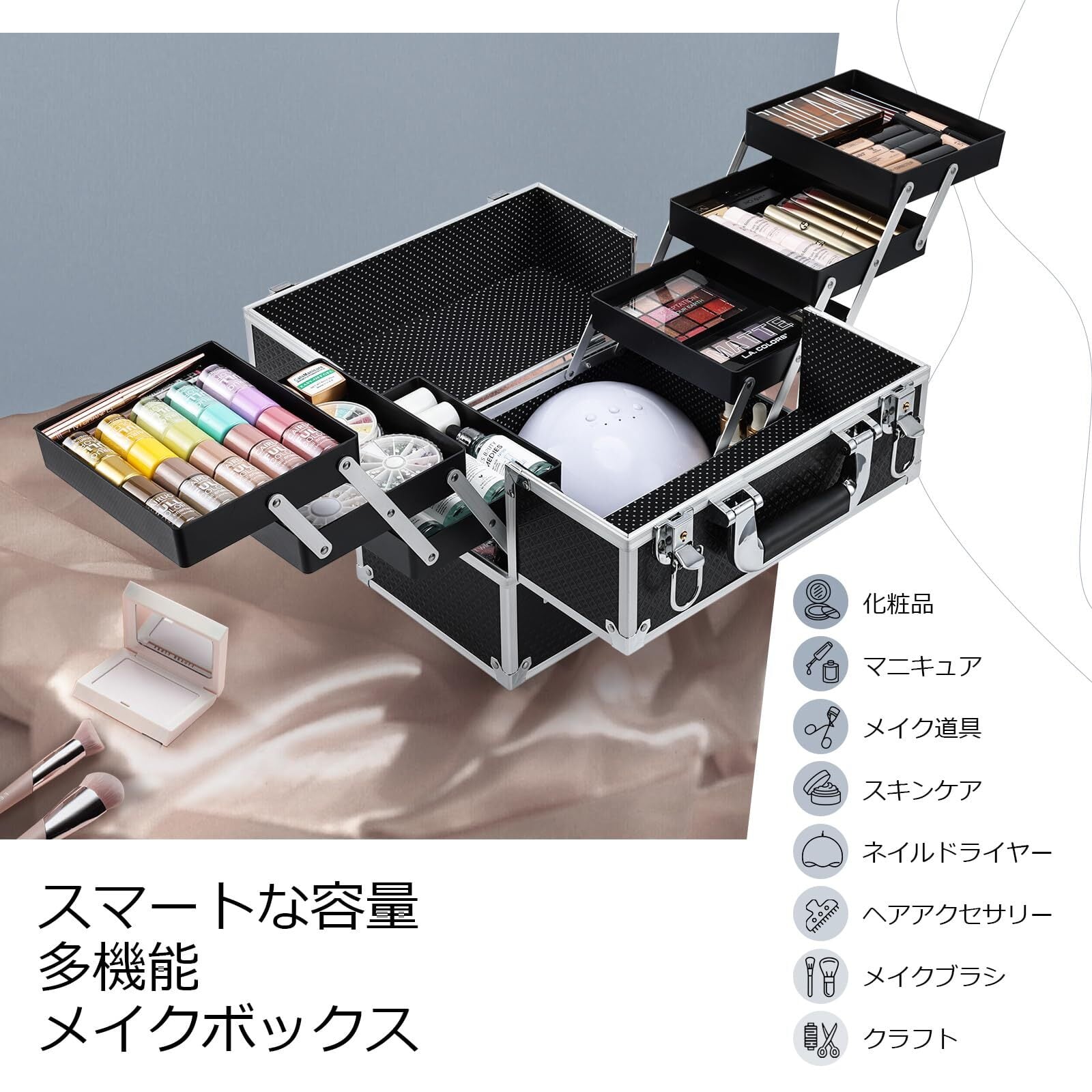 【機能美】歪みや割れに強い、丈夫で持ち運べる化粧箱です。アルミニウム製の超軽量のトレイは伸縮可能で、スムーズな三段階調整が可能です。耐振性に優れるデザインでコスメを引きかける時、しっかりしています。金具アクセサリーの光沢感も化粧ボックスの高級感を演出します。