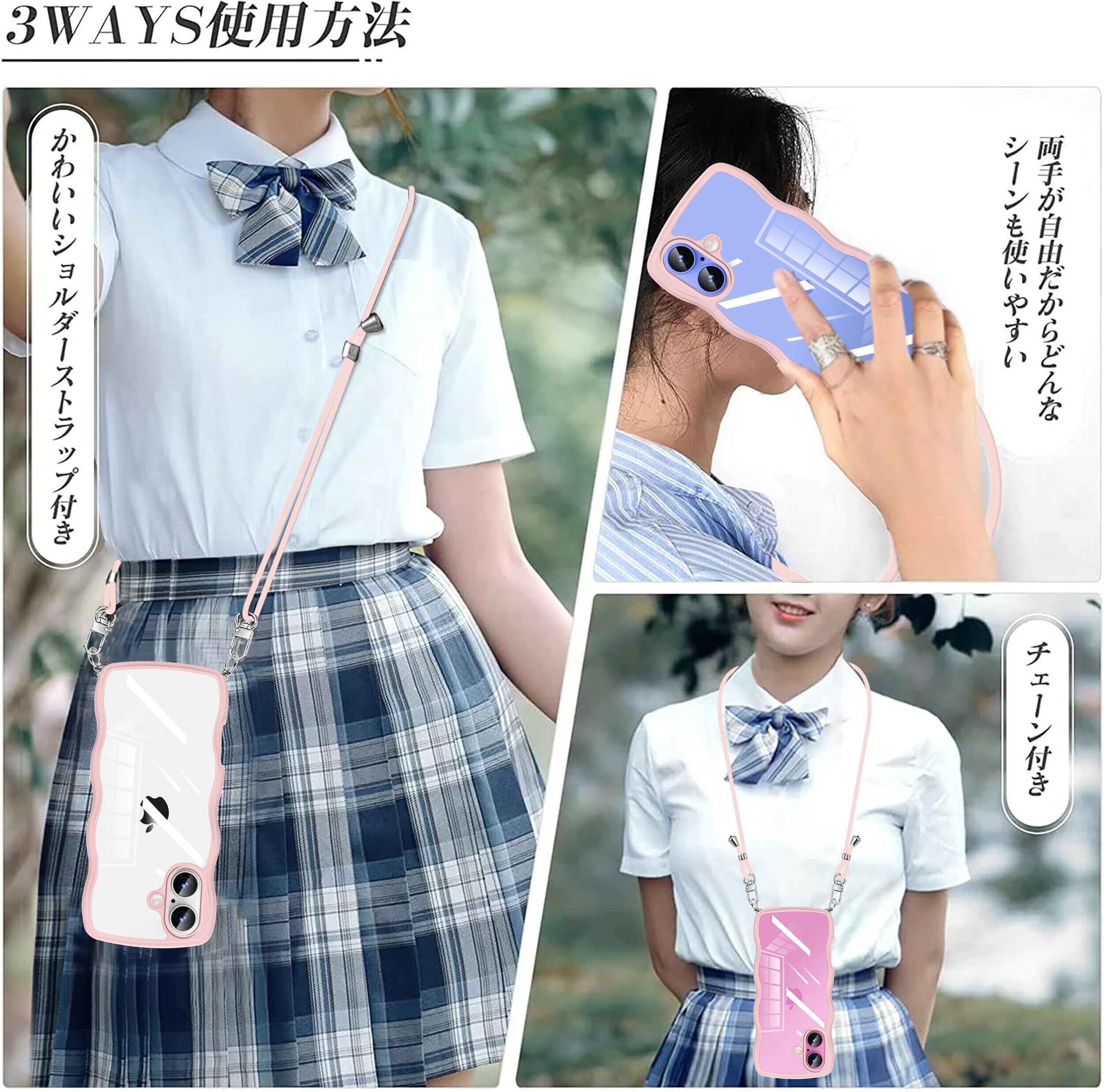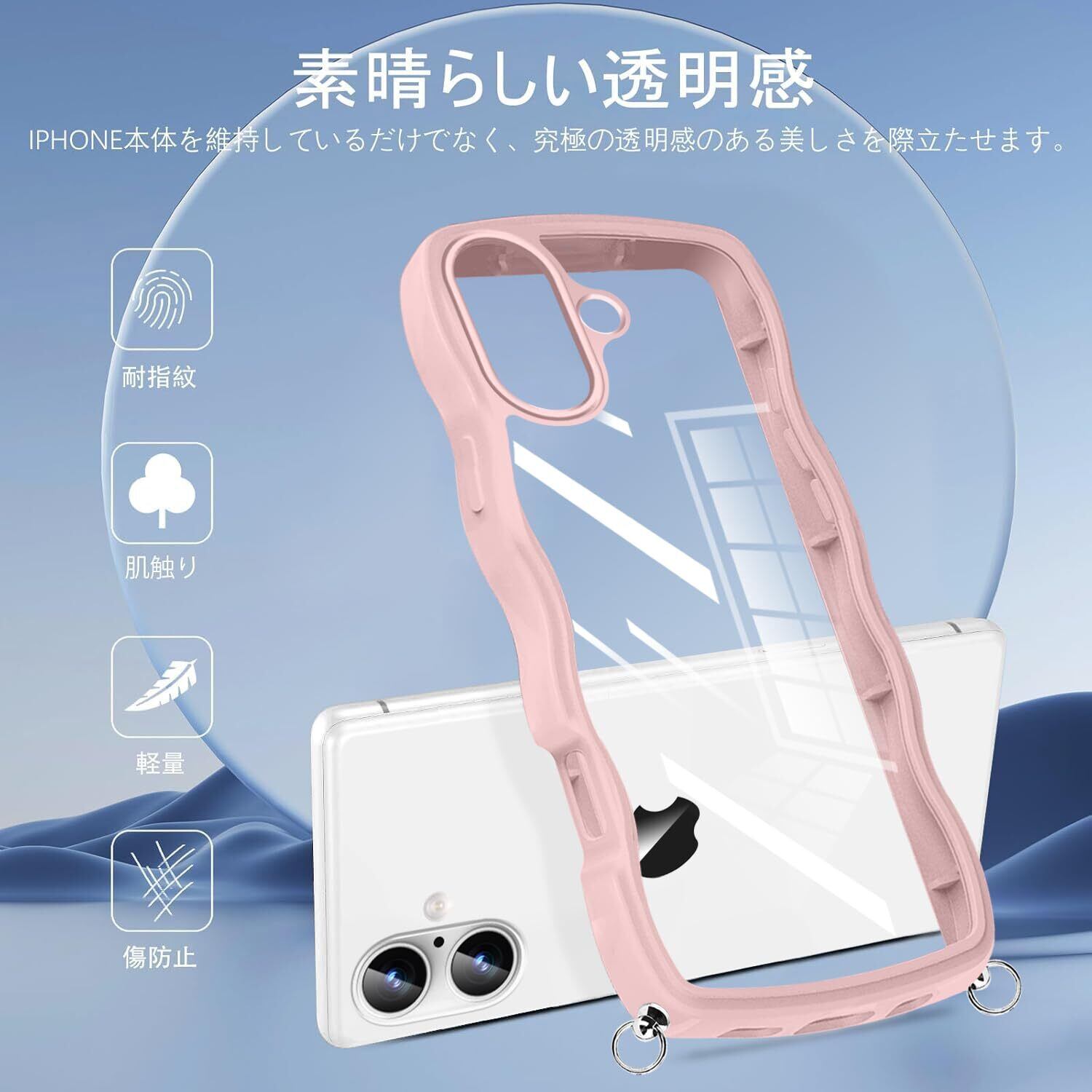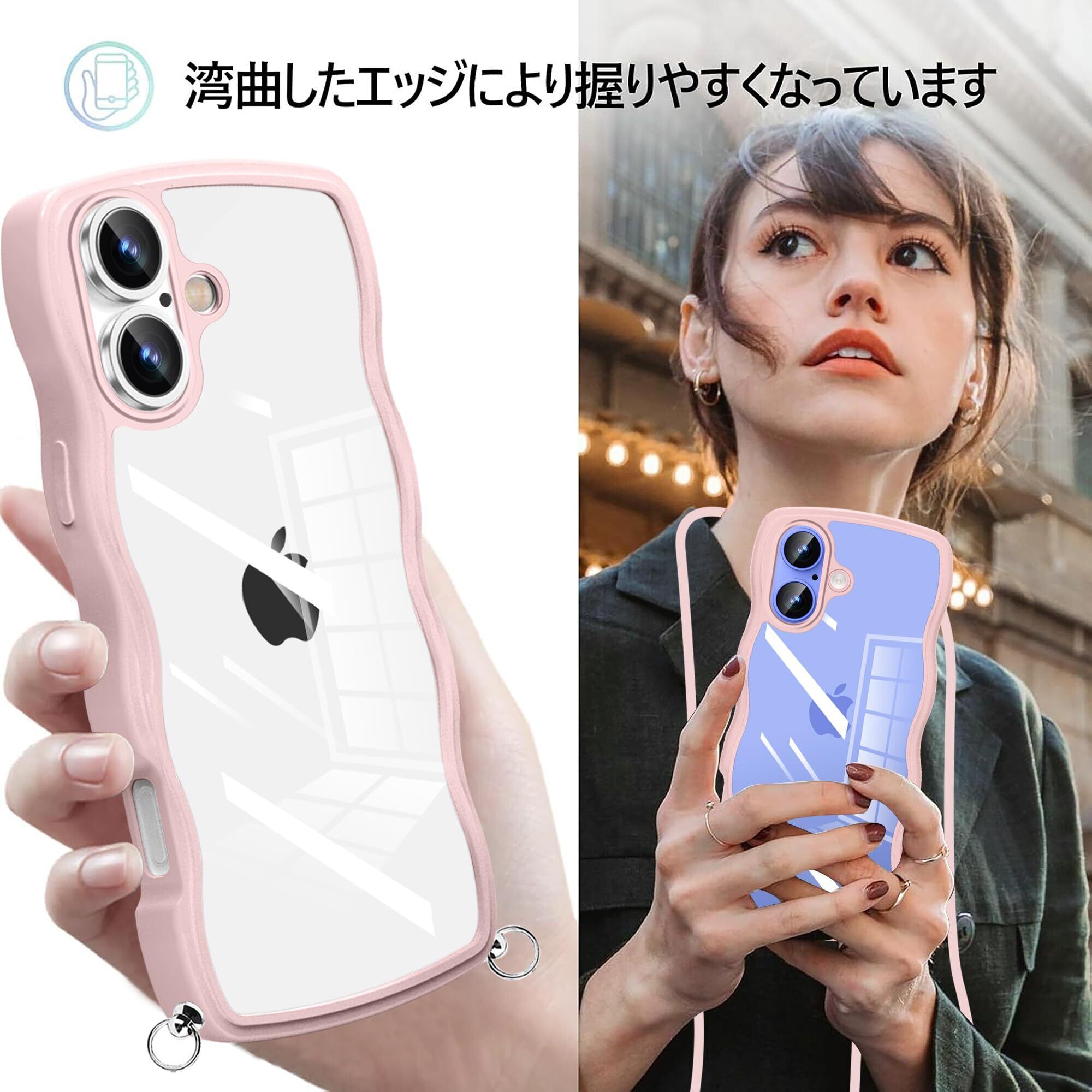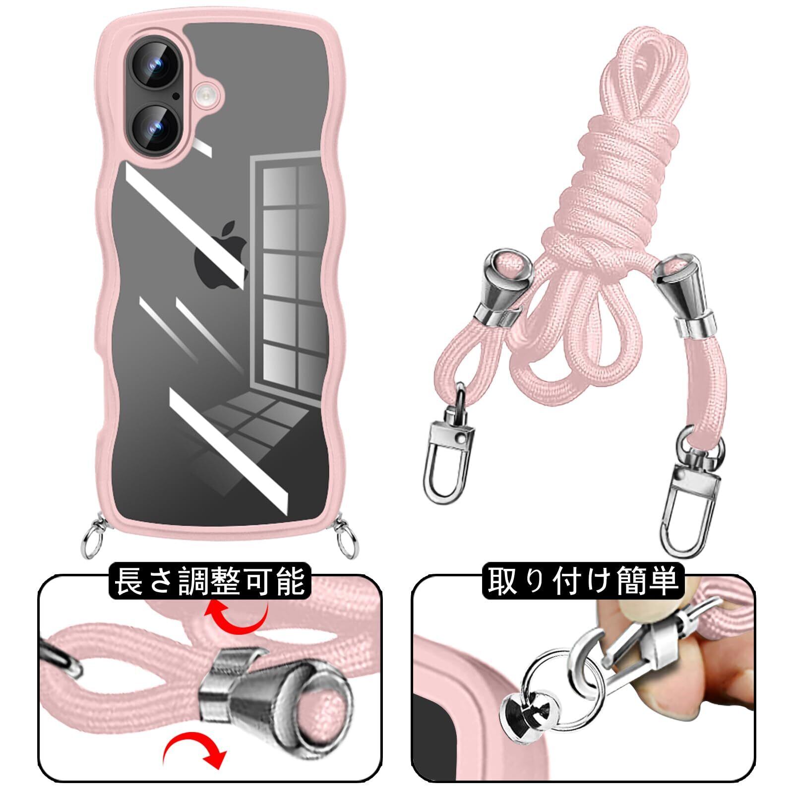 iPhone 16 用 ケース クリア ショルダー ストラップ付き アイフォン 16 用 カバー かわいい 波状フレーム 人気 耐衝撃 透明 iPhone16 用 スマホケース 首かけ 肩掛け 薄型 軽量 QIワイヤレス充電対応(ピンク)