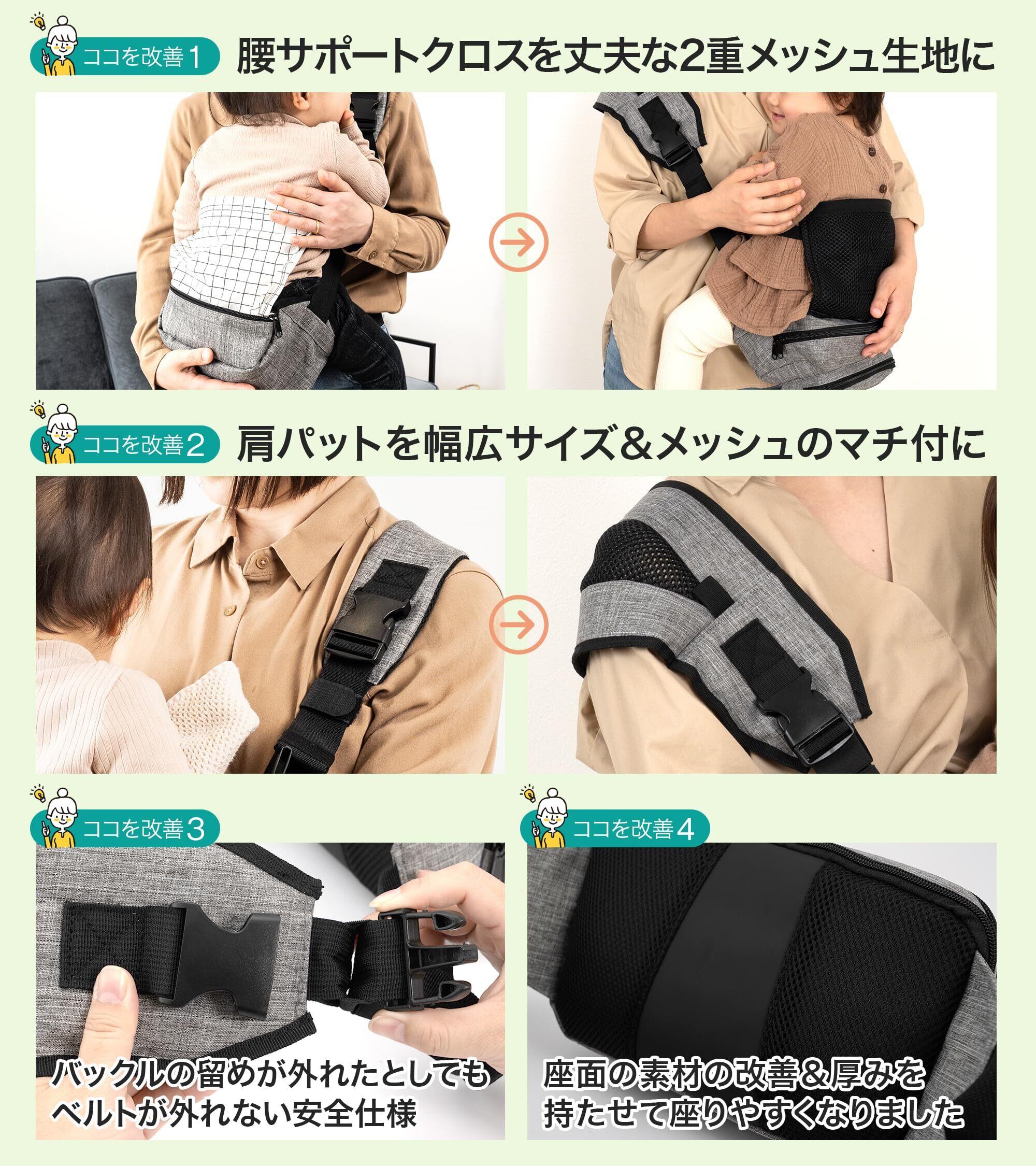 【ここを改善しました!】お客様のお声を反映して改善しました。①腰のサポートクロスを丈夫な2重メッシュ生地に改善。お子様をしっかりと支えられるようになりました。②肩ベルトを幅の広いタイプ&メッシュ生地のマチを追加しました。③ショルダーベルトのバックルが万が一外れてしまっても、ショルダーベルトが外れないように2重ロックになっています。④座面の生地を変更し厚みを増しました。