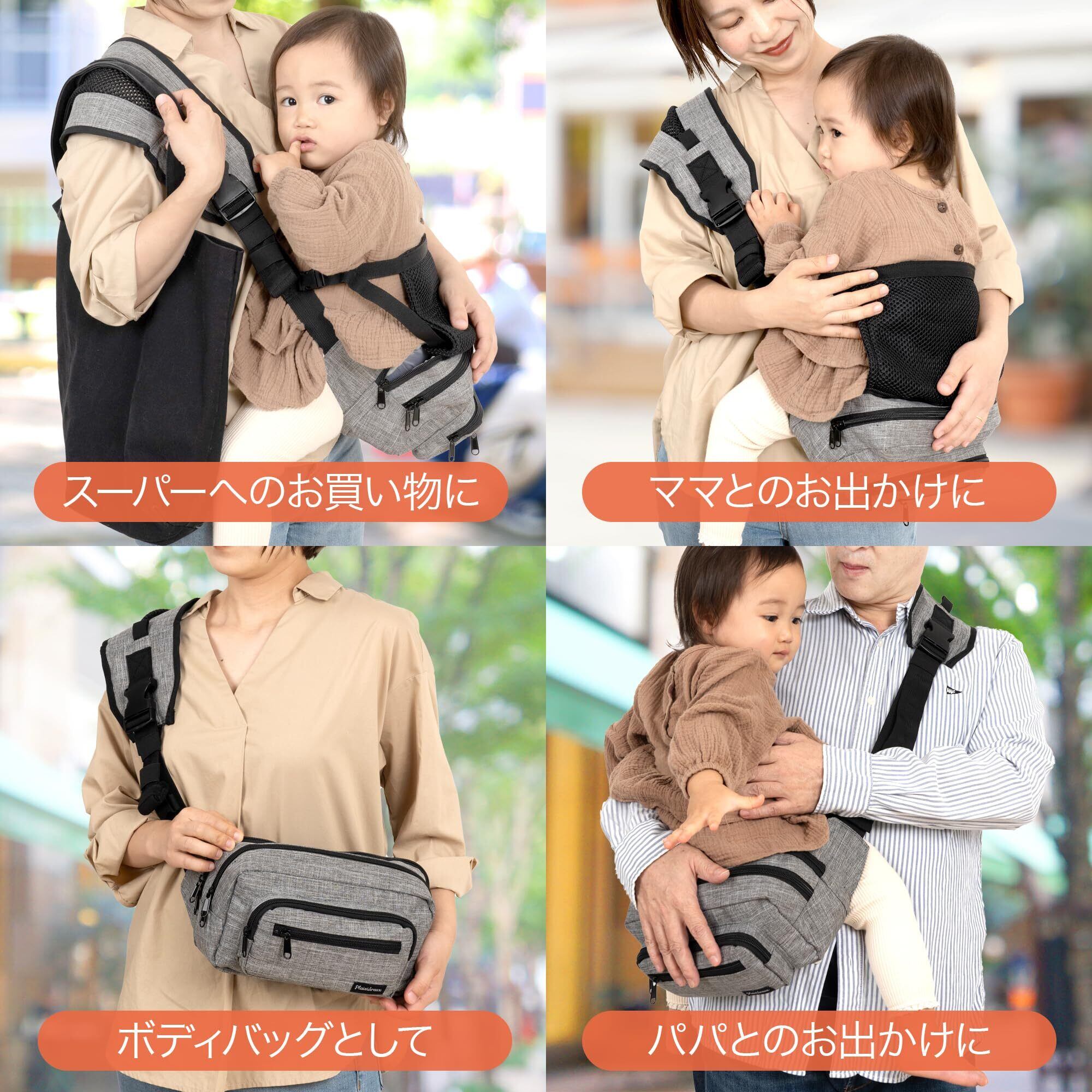 【商品仕様】○サイズ:バッグ部分横27cm×縦16cm×マチ7.5cm、肩パッド横37cm×幅10cm ○対応年齢:6ヶ月~4歳頃 ○耐荷量:約20kg ○素材:ポリエステル ○カラー:ブラック、デニムグレー ○ご注意:安全のため、腰サポートクロス使用、未使用に関わらず、必ずお子様を片手で支えてご使用ください ○ブランド:Plaisiureux(プレジュール)