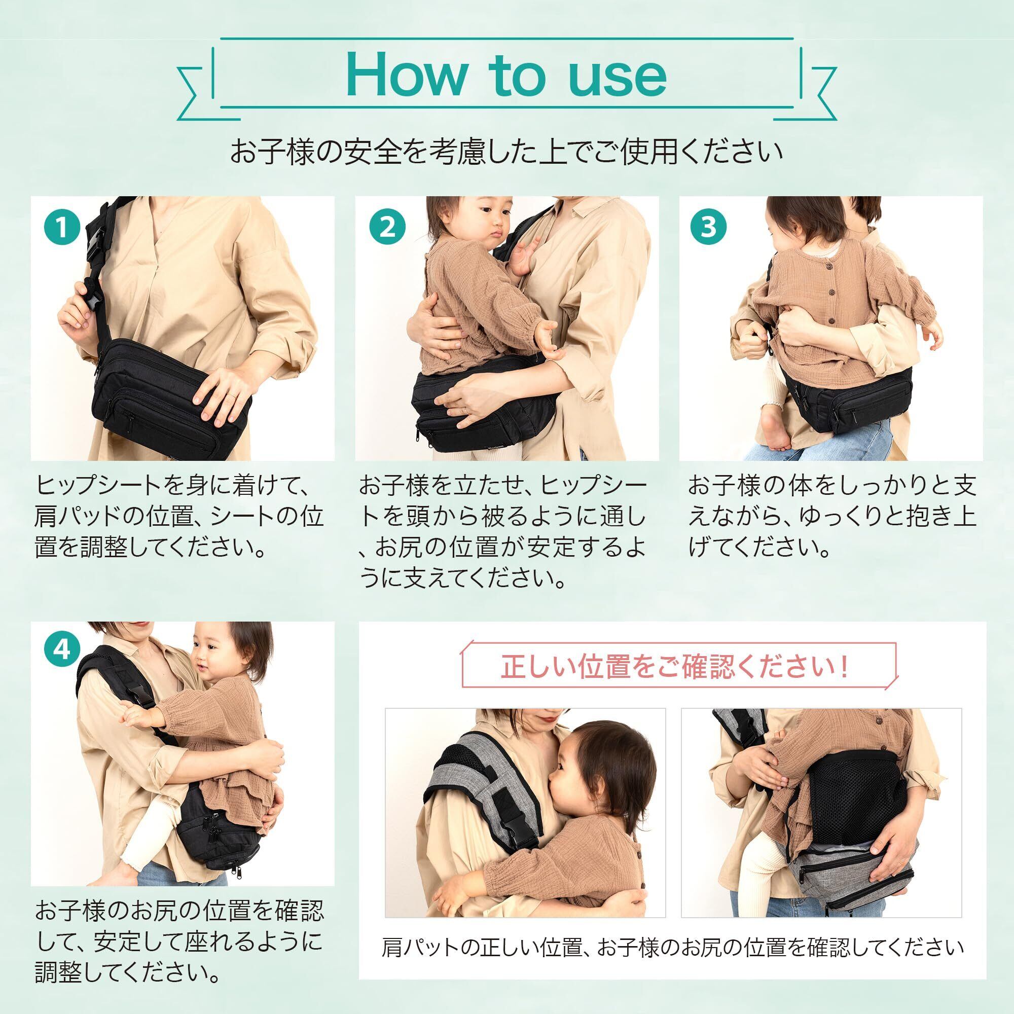 【安全性・耐荷重量試験合格】日本の検査機関で、安全性、耐荷重量の試験を行い合格しました。ヒップシートは、体重20kgまで(6ヶ月~4歳頃)の腰の座ったお子様が対象になります。安全性に十分配慮しながらご使用ください。