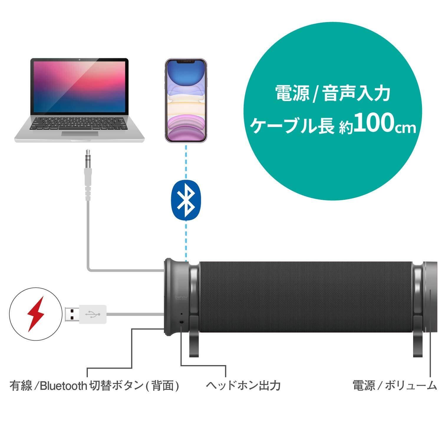 パソコンやスマートフォン/タブレット、テレビなど接続機器を問わず、さまざまなシーンで使用できるミニサウンドバースピーカー“behav(ビヘイブ)"です。