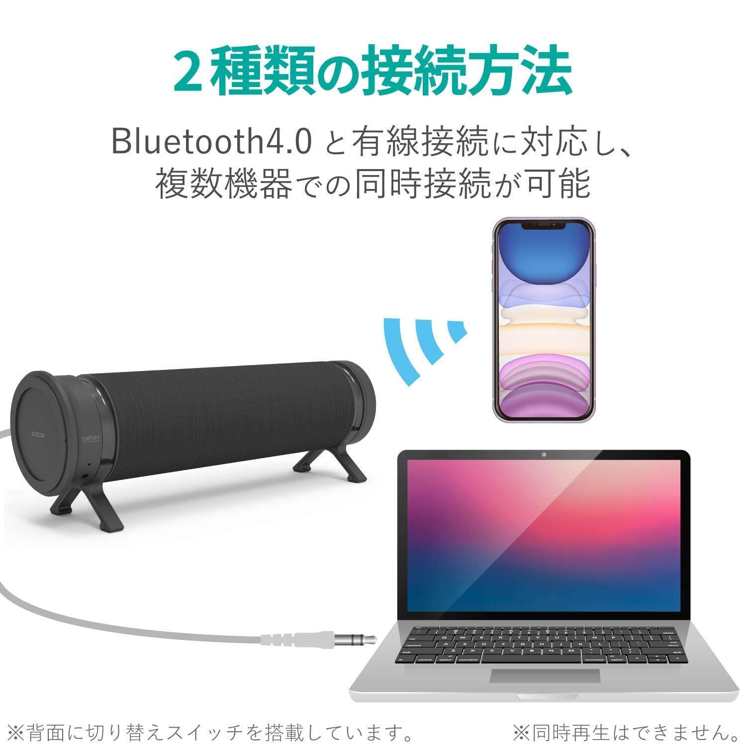 音楽再生は有線(ステレオミニプラグ)接続とBluetooth(R)接続の両対応で、パソコンとスマートフォンなど複数の機器からの再生が可能です。※有線とBluetooth(R)の同時再生はできません。