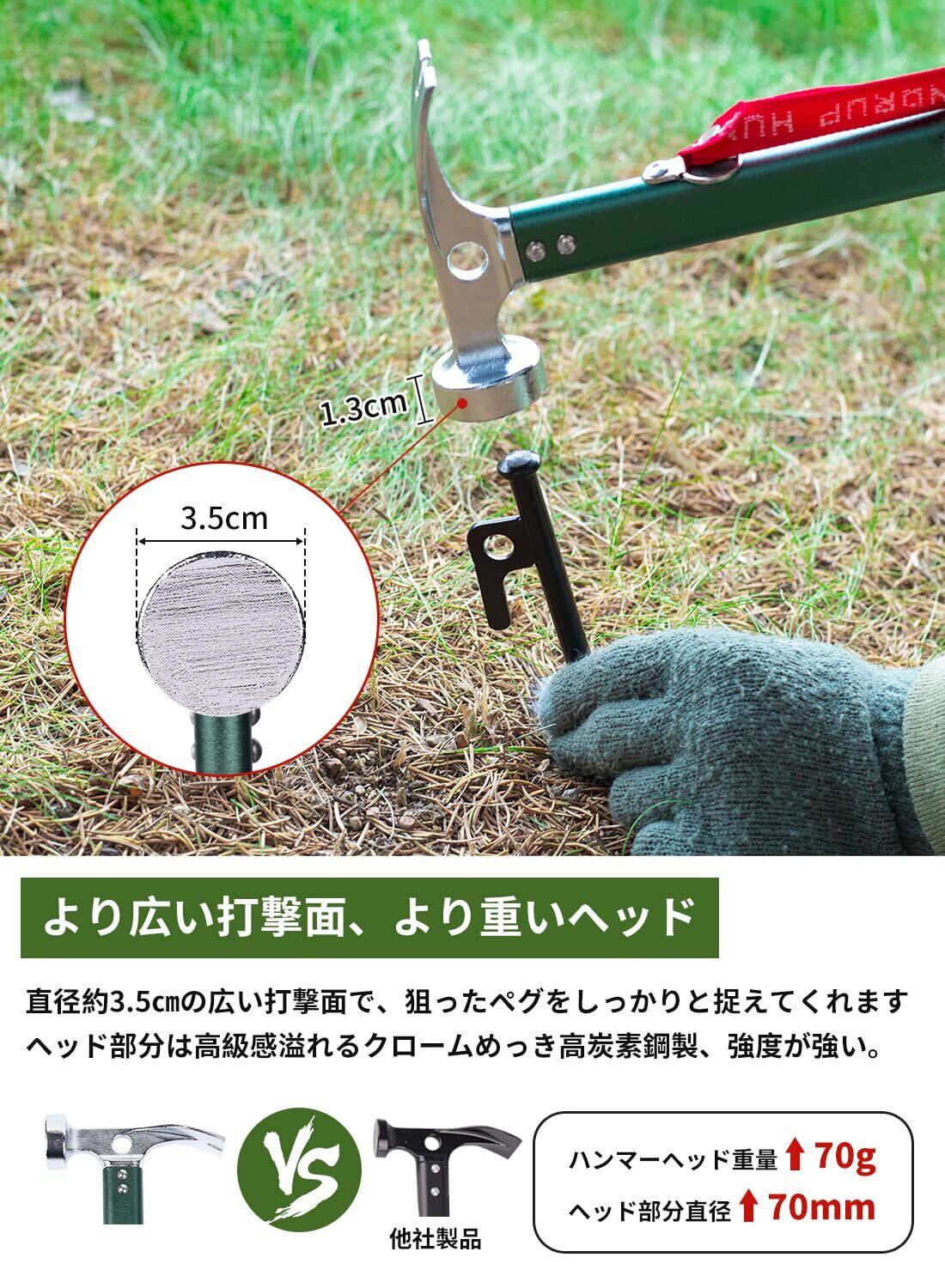 【進化した細部と品質】:ヘッドは打撃部分がペグにヒットさせやすい大きさで、直径約3.5㎝の広い打撃面で、市販の直径2.8cmのハンマーと比べて、狙ったペグをしっかりと捉えてくれます。 ヘッドの重量を70g重くすることで、硬い地面でもペグをぐいぐい打ち込めます。
