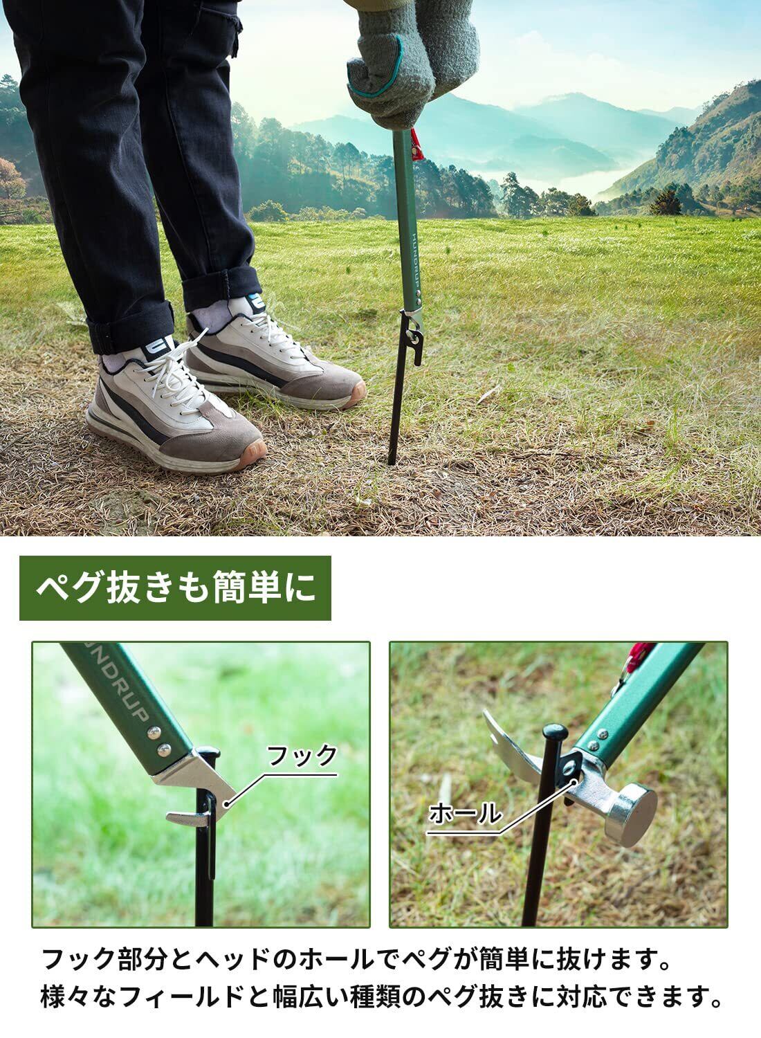 【3in1多機能ハンマー】:デザイン性と機能性を兼ね備えました。ペグの打ち込み、ペグの引き抜き、穴掘りがすべてこの一本でできます!①テントハンマーの頭部は重量感のある高炭素鋼で、固い地面でもぺぐを固定できます。②ヘッド片側はスコップとして使え、邪魔な石を取り除いたり、土壌や砂などを掘り起こったりすることができます。③ペグハンマーの後部に設けられたフックとホールを使ってあらゆるタイプのペグを抜くことができます。