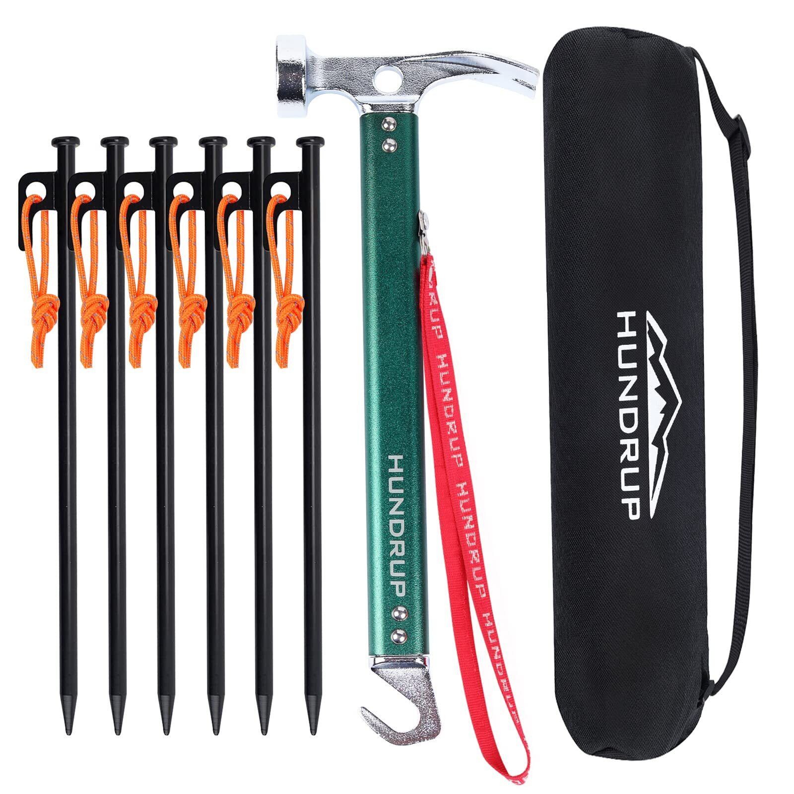【革新版】ペグハンマーセット HUNDRUP 鍛造ペグ30CM 6本 反射材ロープ付き テントハンマー 高炭素鋼 収納袋付きアルミ製 軽量 ペグ打ち ペグ抜き 土堀り アウトドア 登山 設営器具