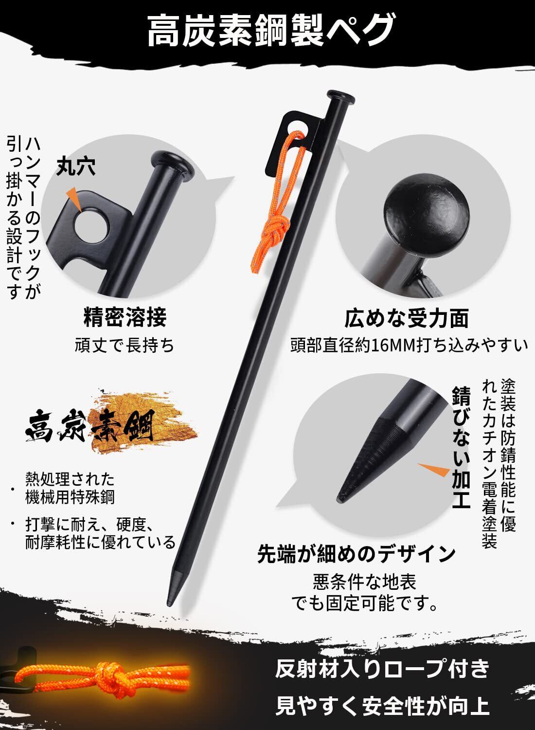 【梱包内容】:高炭素鋼ハンマー *1本、ペグ30cm *6本、600Dオックスフォード収納袋*1点。【重さ】:(約)1550g/セット