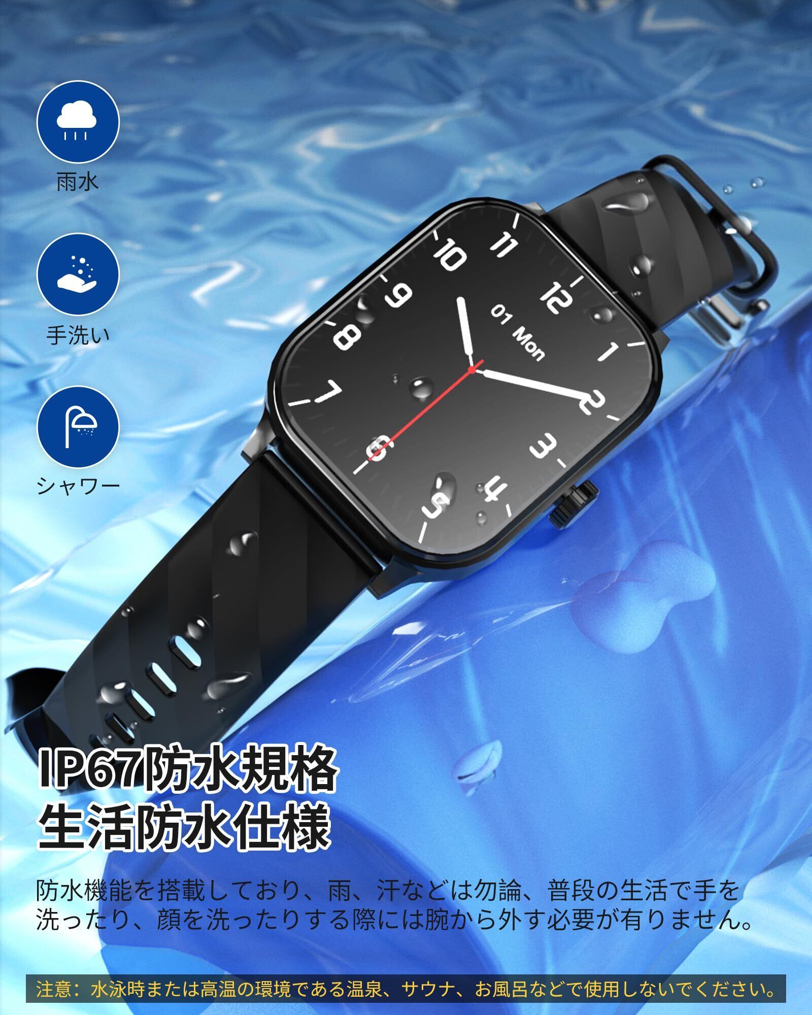 「IP67防水&長持ちバッテリー」:IP67レベルの防水性能を持っており、日常生活の手洗いや洗顔の際も取り外す必要ありません。また、本スマートウォッチに300mAh大容量バッテリーが内蔵され、一度フル充電をしたら5-7日使用可能となります。ご注意:※お風呂、サウナ、温泉水や温泉の湯気及び高い水圧は故障の原因となります。※個人の利用状況によっては、持続可能な利用時間が異なります。