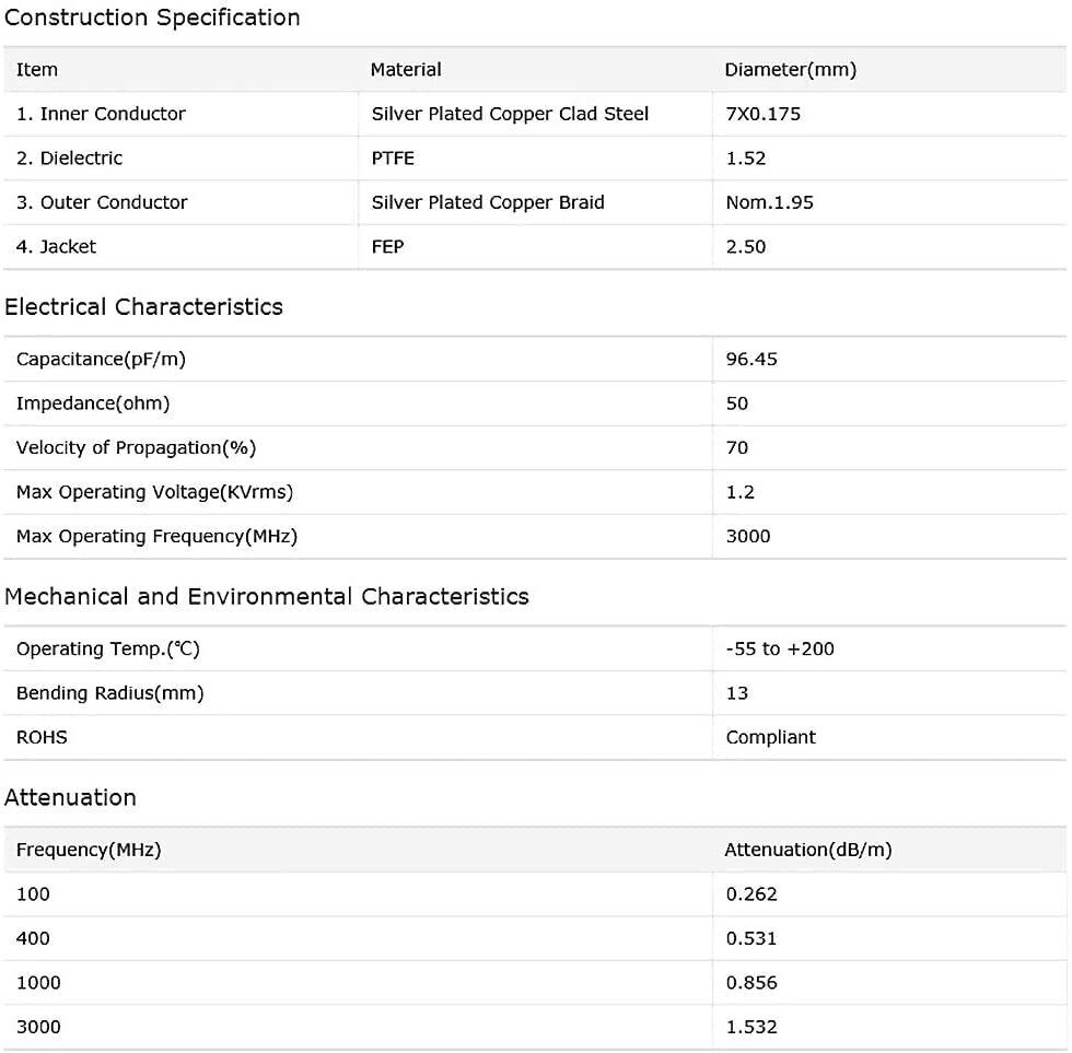 絶縁体:テフロン(PTFE) RG-316/U 特性インピーダンス:50Ω。