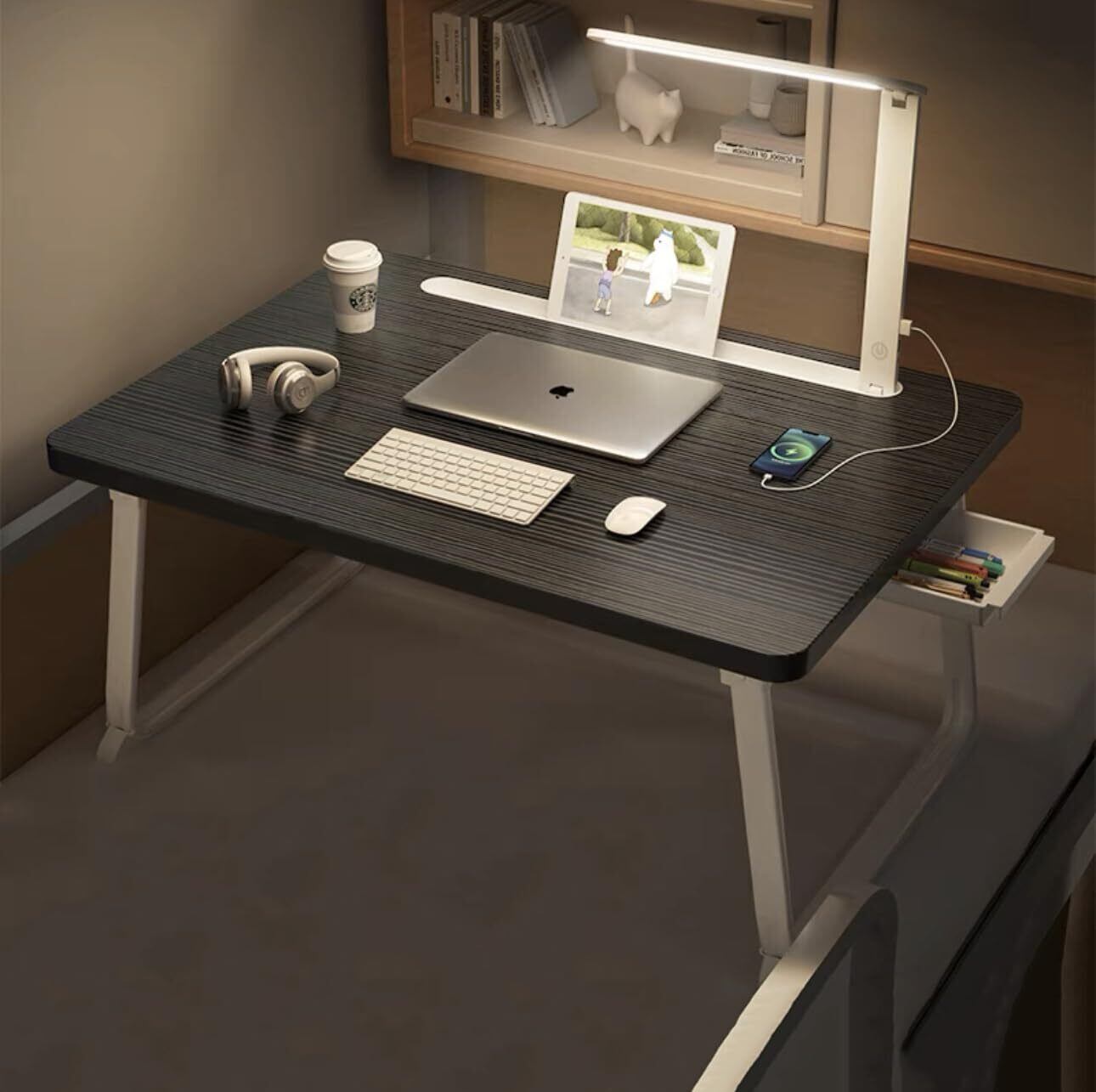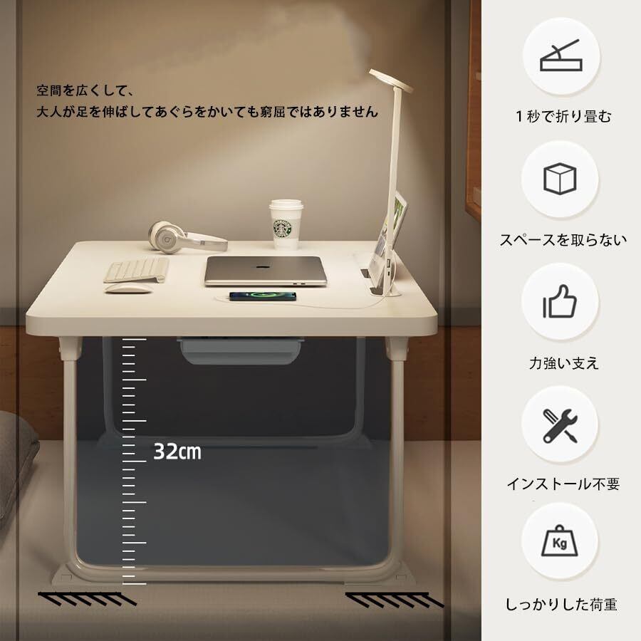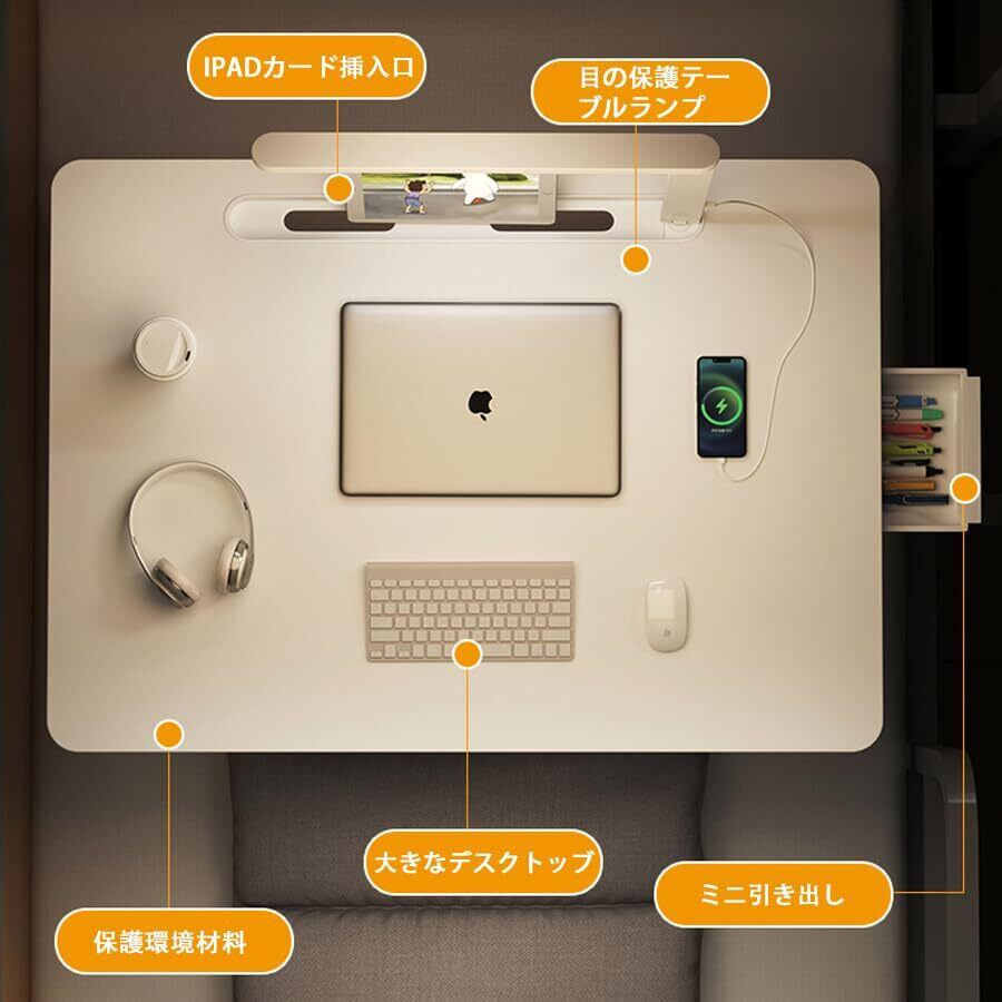 【多機能折りたたみテーブル】読書灯付属しています、折りたたみテ ーブルには、ミニ引き出し、2*USBポート・タブレットスロット(最長辺の27CMを超えないタブレットに適用)があって、ラップトップ やスマホやタブレットに充電するのが便利です。ホームオフィスや寮の勉強に最適です。