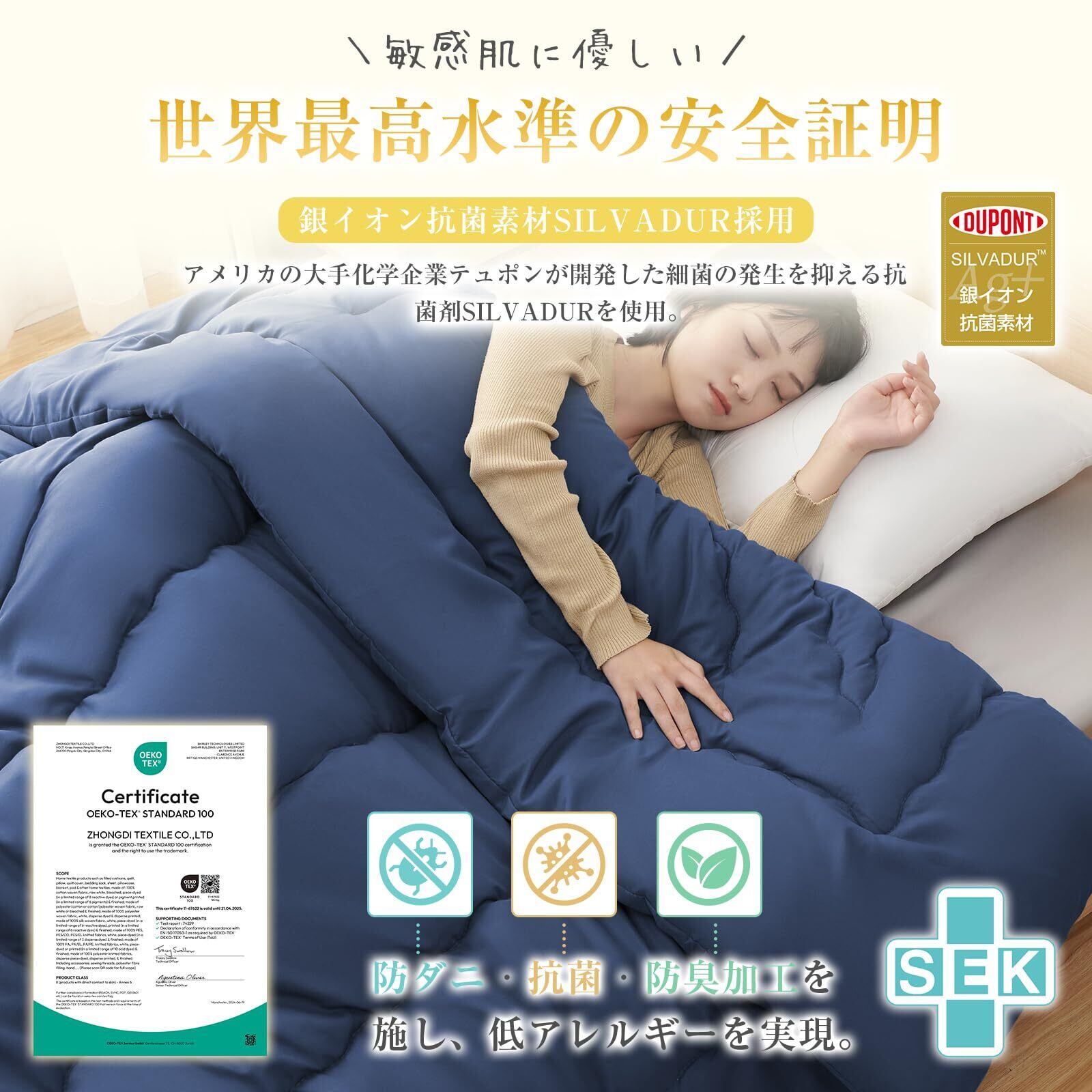 【銀イオン抗菌素材SILVADUR採用、SEKマークを取得】認証マークで高品質、アメリカの大手化学企業デュポンが開発した細菌の発生を抑える抗菌剤SILVADURを使用します。 確かな技術でいつまでも生地を清潔に保ちます。掛けふとんの側地に抗菌・防臭・防カビ加工を施しています。SEK認証された優れた抗菌防臭効果で、細菌の増殖を抑え、防臭効果を発揮します。