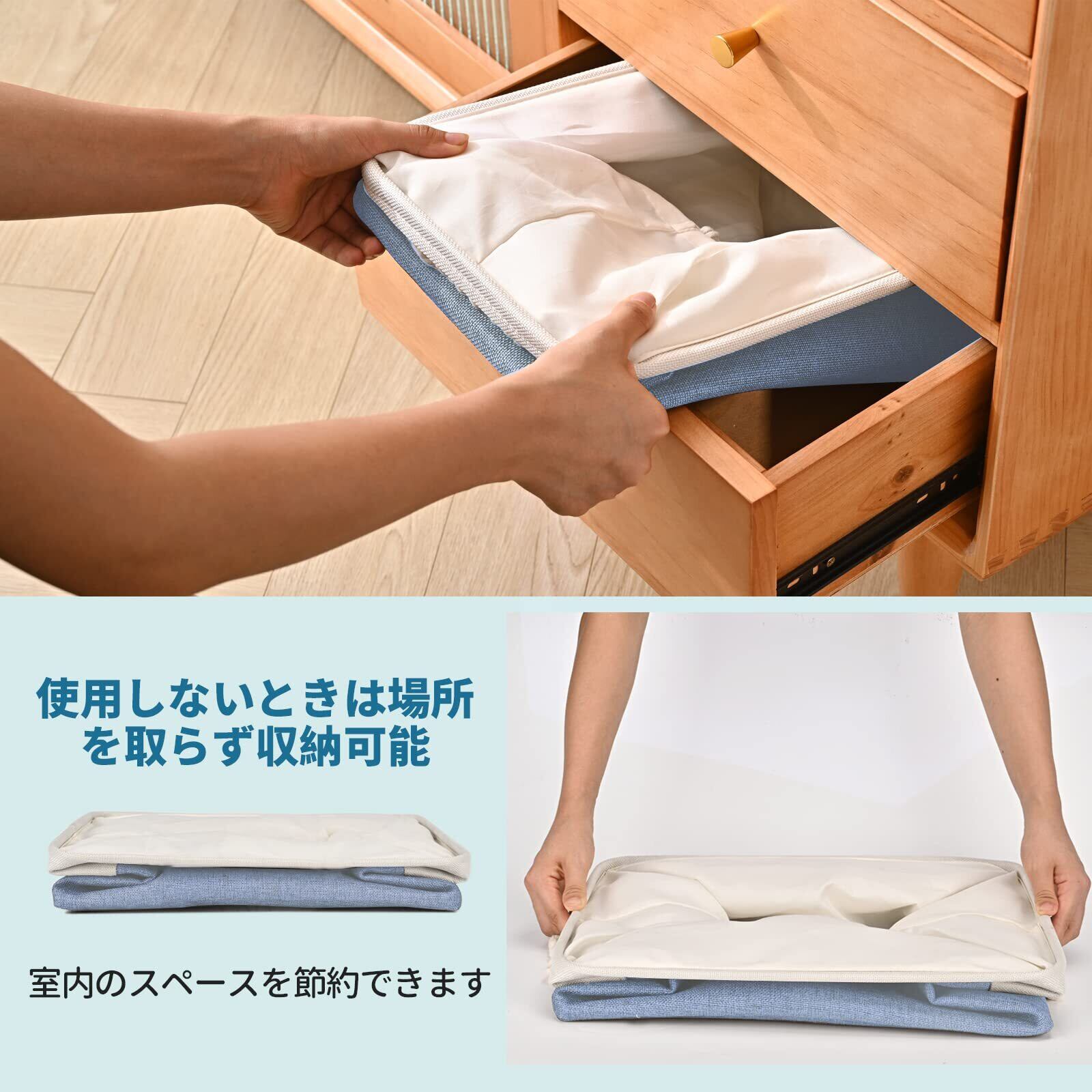 【軽量・折り畳む式】 収納バスケットは折りたたみ式ですからとても省スペースです。使用していないときは平らに折り畳むと簡単に保管できます。軽量ながらも非常に便利で実用的にデザインされています。