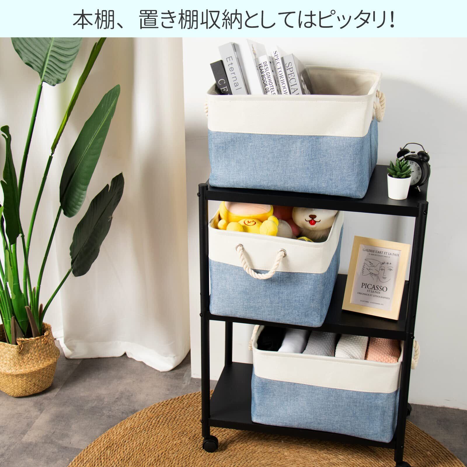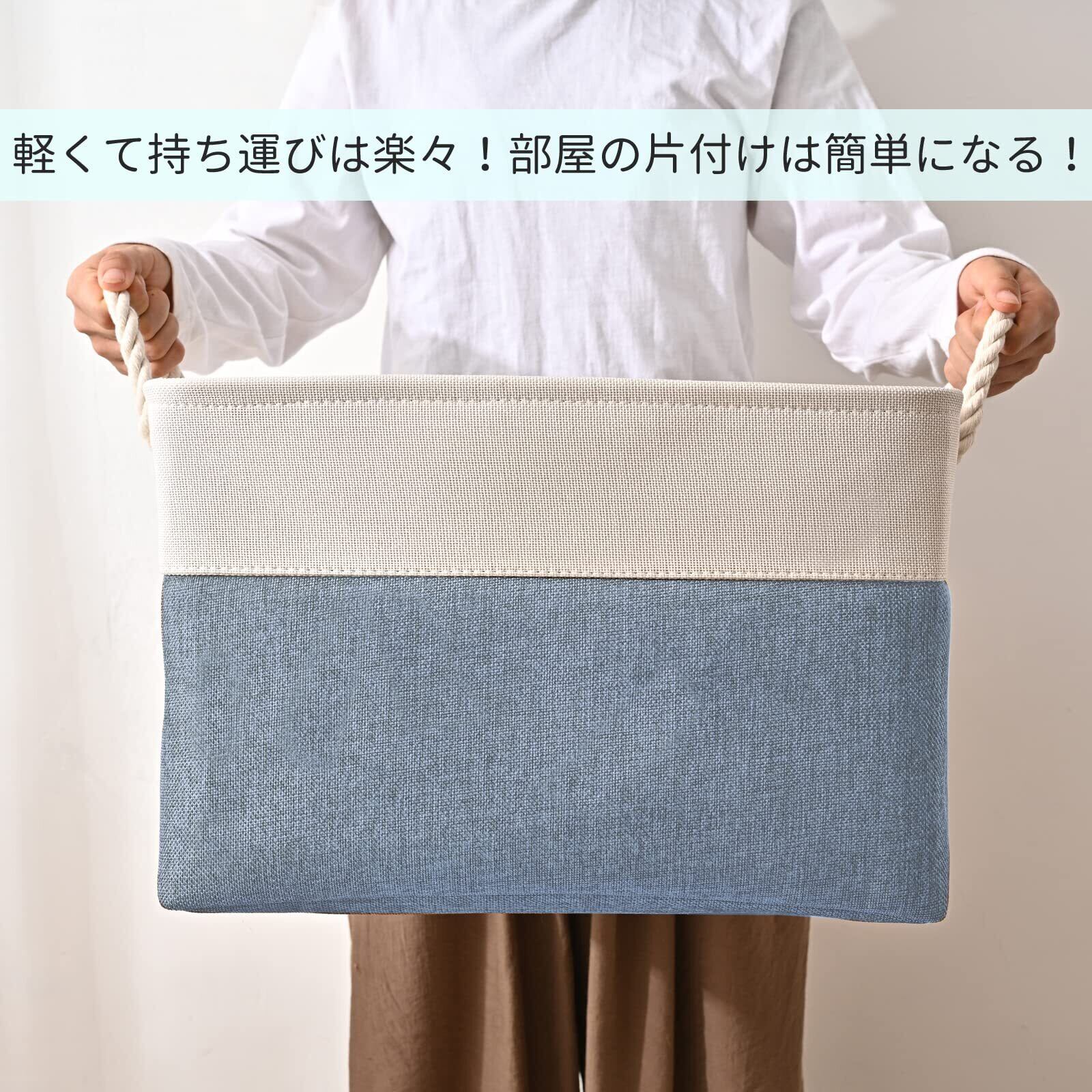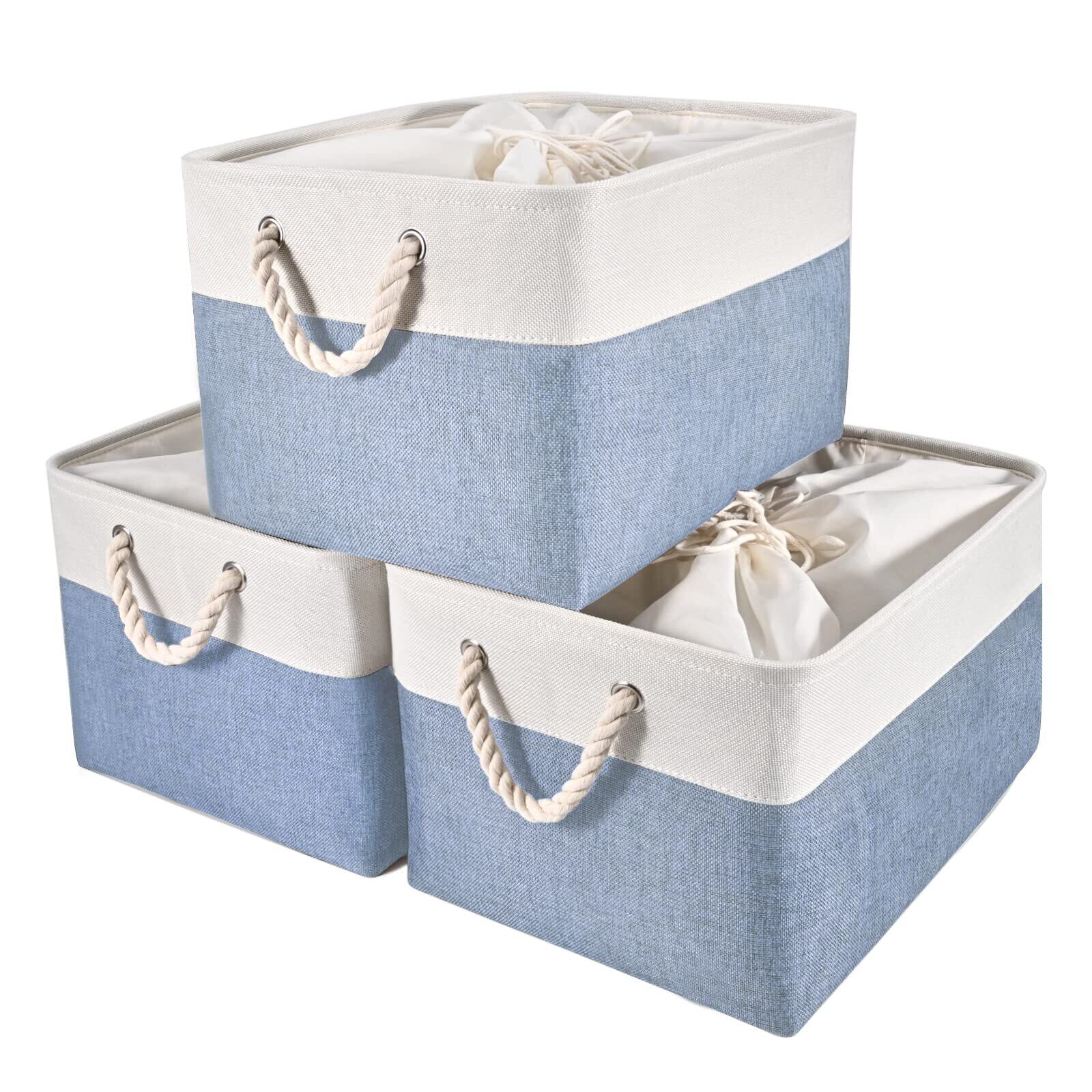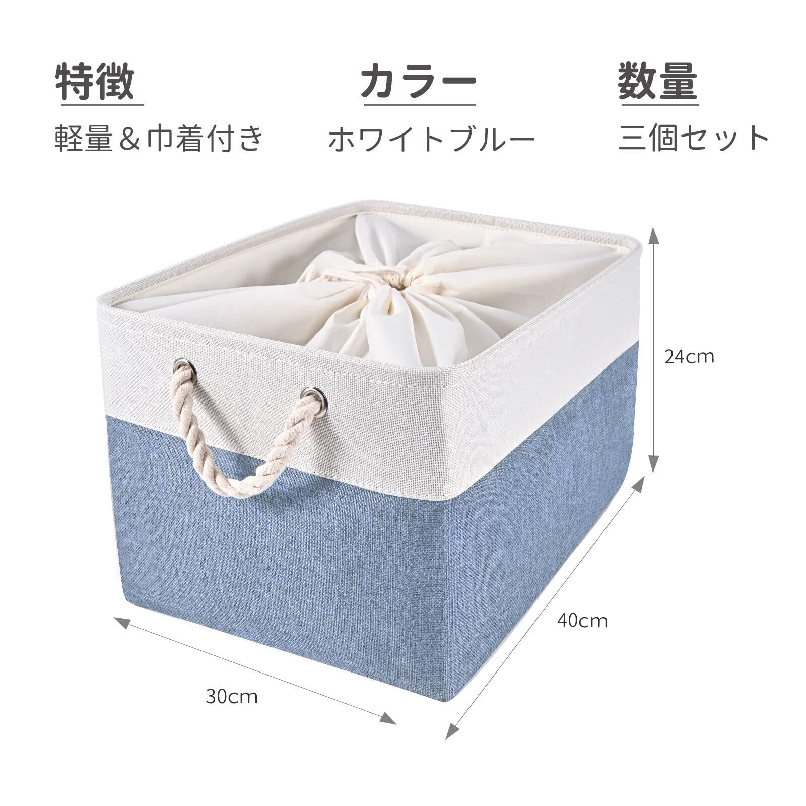 【Amazon.co.jp 限定】STVICTORY 収納バスケット 収納かご 3個セット 40×30×24cm 無臭 巾着 取っ手付き オシャレな収納ボックス ランドリーバスケット ストレージバスケット 布 洗濯かご インテリア雑貨 衣類 小物収納 引き出し 折り畳み式 綿麻製 防水 防湿 防塵 高耐久性 長方形 (ホワイトブルー)