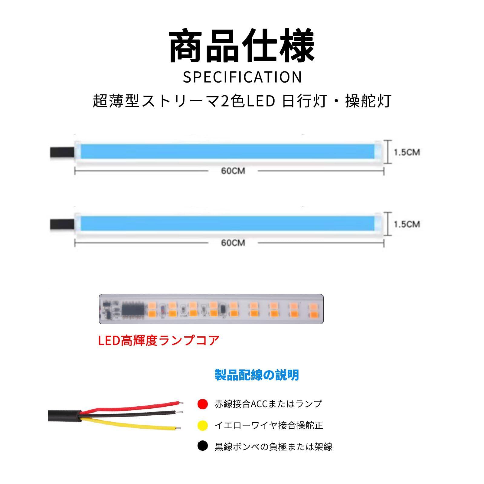 【2色】このLEDストリップはバイカラーで、流れるLED 昼間アイスブルー色点灯、流れるようなアンバー(黄色)はインジケーターとして使用します。ご注意:取付の際に、バッテリーに繋がって先に点灯確認を行ってください。